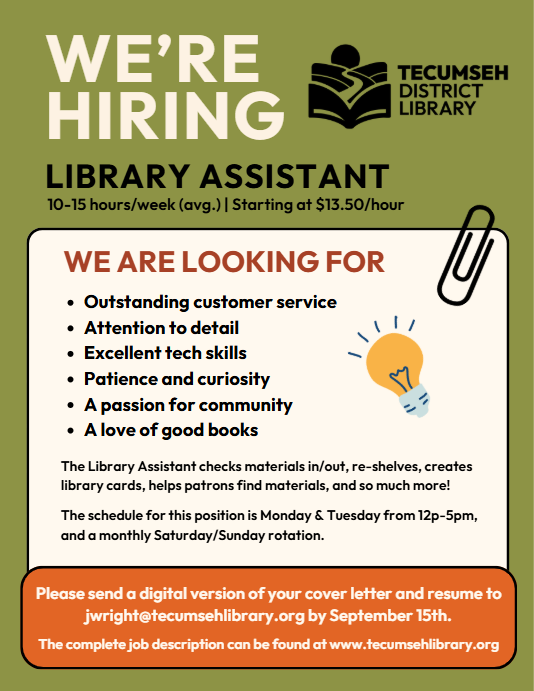 The Tecumseh District Library is hiring a part-time Library Assistant. The Library Assistant checks materials in/out, shelves, creates library cards, helps patrons find materials, and so much more! The schedule for this position is Monday and Tuesday from 12-5 pm, and a monthly Saturday/Sunday rotation. The starting wage is $13.50/hour. Please send a digital version of your cover letter and resume to jwright@tecumsehlibrary.org by September 15th. The complete job description can be found at www.tecumsehlibrary.org. [image: image.png] -- Jordan Wright Library Director Tecumseh District Library 215 N Ottawa St, Tecumseh, MI 49286 jwright@tecumsehlibrary.org | 517-423-2238 x. 11