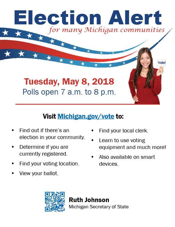 Good morning! On May 8, many local communities across Michigan will be having elections, so we are once again asking all libraries to post the attached flyer and share the following messages via your communication channels. On Monday, May 7, we will send you another social media message that we hope you will also share as a final reminder. As always, thank you for your help! Text for Newsletters and Websites: Election Alert Many Michigan communities to host elections May 8 Secretary of State Ruth Johnson is encouraging all eligible voters in communities hosting elections to cast their ballots on Tuesday, May 8. To determine if your community has an election or to view a sample ballot, visit the Michigan Voter Information Center at www.michigan.gov/vote<http://www.michigan.gov/vote>. The polls are open on Election Day from 7 a.m. to 8 p.m. Text for Social Media: * Twitter: Tues., May 8 is #Election<https://twitter.com/search?q=%23Election&src=hash> Day in many communities in MI. Find out if your hometowns has an election & view your ballot at mi.gov/vote<http://www.michigan.gov/vote>. @MichSOS * Facebook: Have your voice heard! Tuesday, May 8 is #Election Day in many Michigan communities. Visit Michigan.gov/vote<http://www.michigan.gov/vote> to view your ballot and find your voting location. @MichiganSOS Cathleen Simlar Cathleen P. Simlar Communications Specialist, Executive Office Michigan Department of State Office: (517) 373-9080 Cell: (248) 761-7145 Email: Simlarc@michigan.gov<mailto:Simlarc@michigan.gov> Join My Professional network on LinkedIn<blocked::http://www.linkedin.com/pub/cathleen-simlar/18/798/235> [Description: Description: Description: SOS logo small] <http://www.michigan.gov/sos> STAY CONNECTED: [Description: Description: Description: Facebook logo]<http://www.facebook.com/MichiganSoS> [Description: Description: Description: Twitter logo] <https://twitter.com/michsos> [Description: Description: Description: YouTube logo] <http://www.youtube.com/michsosoffice> [Description: Description: Description: GovDelivery logo] <https://public.govdelivery.com/accounts/MISOS/subscriber/new>