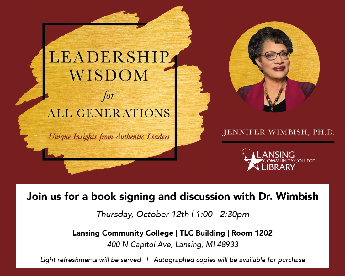 [cid:image001.png@01D9F774.5BB759B0] Hello Michlib-l, The LCC Library would like to invite you to a special book signing event on Thursday, October 12 from 1pm-12:30pm in TLC 1202. Dr. Jennifer Wimbish will discuss and sign her book Leadership Wisdom for All Generations. Dr. Wimbish served Dean of Student and Academic Affairs divisions and Provost at Lansing Community College. She went on to become President of Cedar Valley College. About the Book: In her recently released second edition of the book, Leadership Wisdom for ALL Generations, Dr. Wimbish takes you on a journey, connected to a faith-based worldview, from her childhood in the segregated South, to presidency at a diverse community college, and into retirement. Lessons presented are gleaned from Dr. Wimbish, along with great leaders that have transformed organizations and communities. We look forward to seeing you at this special event. Sincerely, John Szilagyi (he/him/his) Director of the Library Lansing Community College 517-483-1650