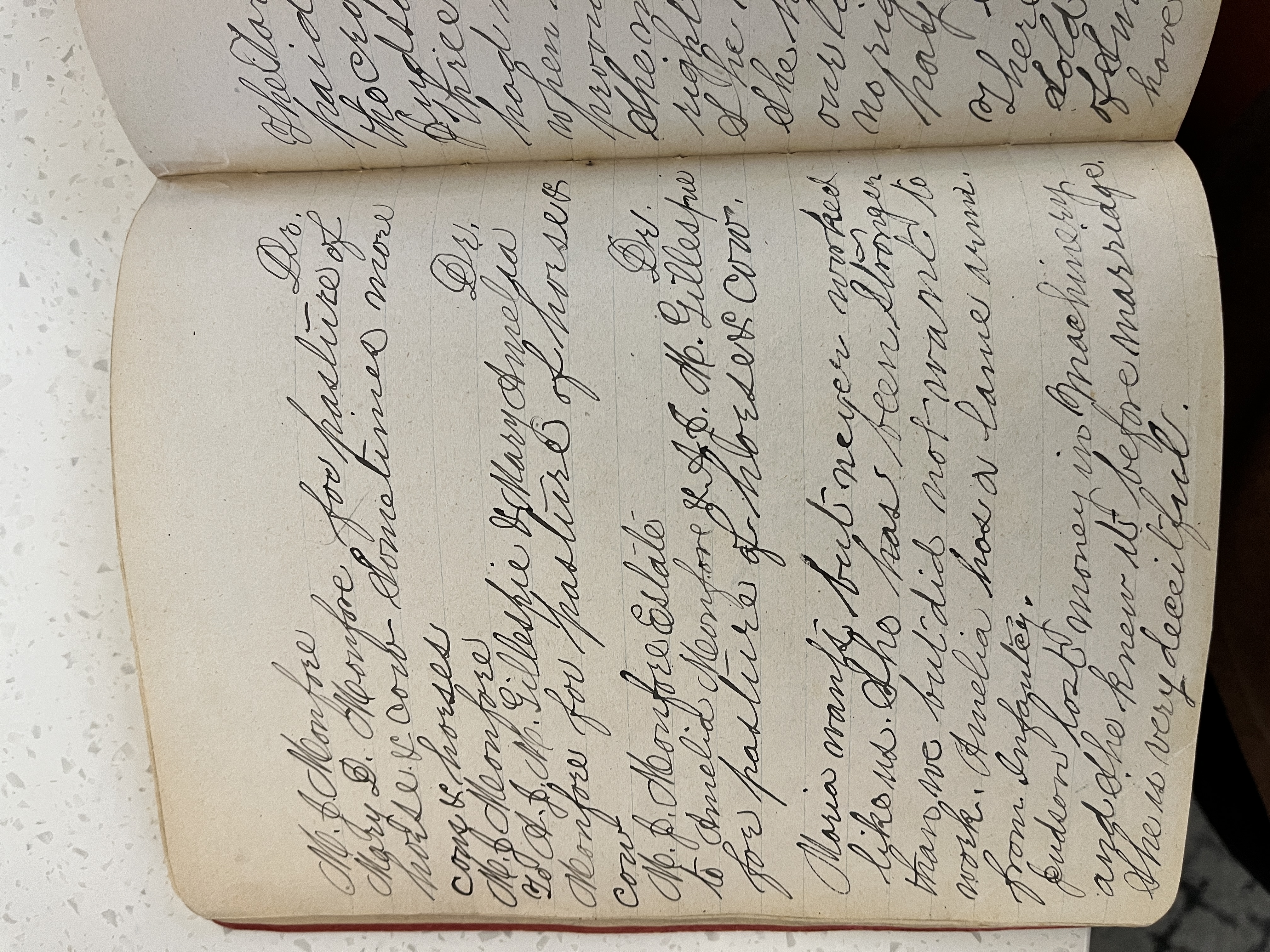 M. J. Monfore Dr. Mary D. Monfore for pasture of horses + cow. Sometimes more cows + horses. M. J. Monfore Dr. To A. J. M. Gillespie + Mary Amelia Monfore for pasture of horse + cow M.J. Monfore Dr. to Amelia Monfore + A. J.M. Gillespie for pasture of horses + cow.