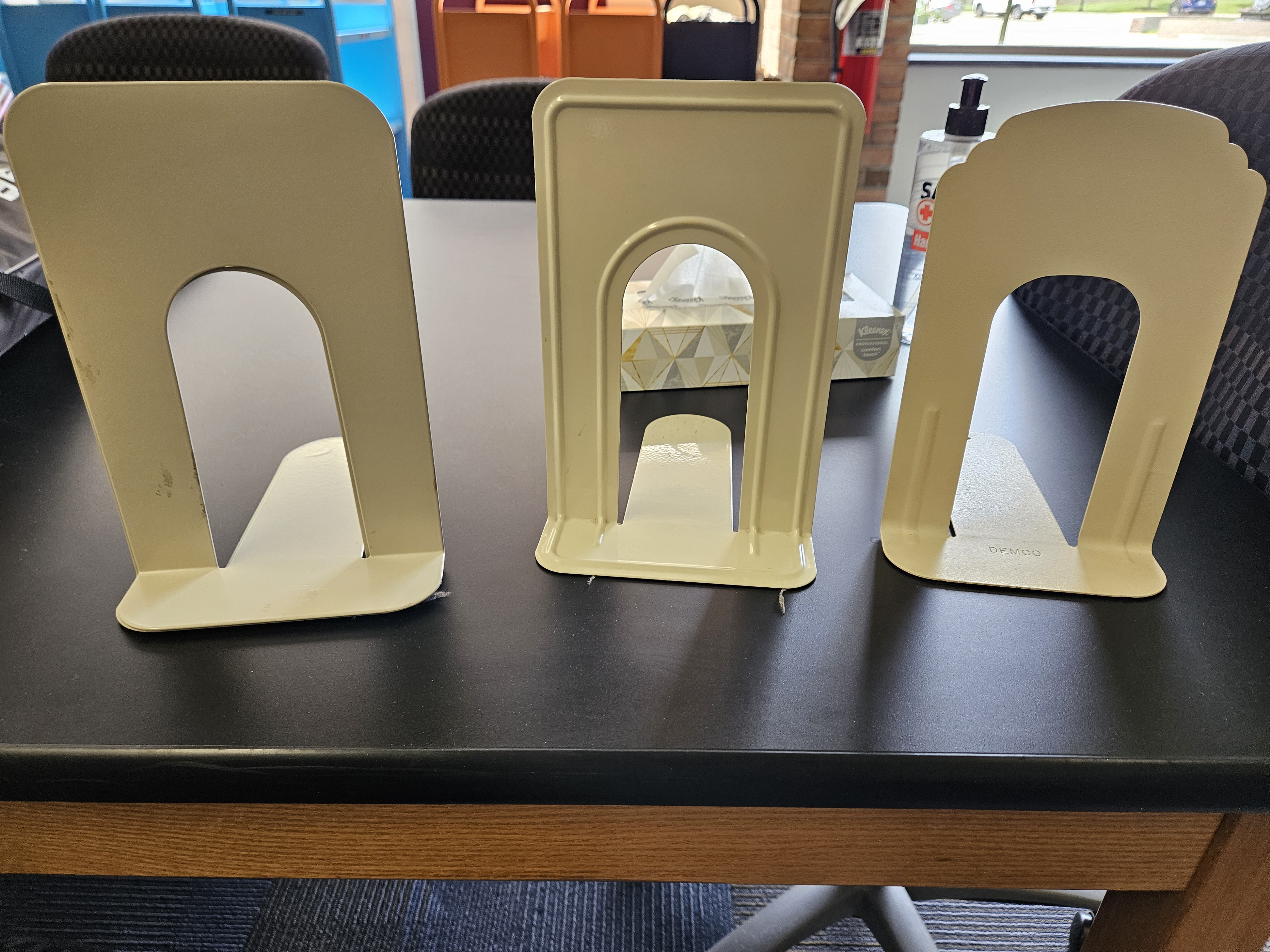 Hello, Troy Public Library has a large amount of metal bookends available. They are all beige/taupe in the 3 patterns shown in the attached photo. They must be picked up from Troy Public Library. Please respond to this email with any questions! Thank you. Cassandra Suh