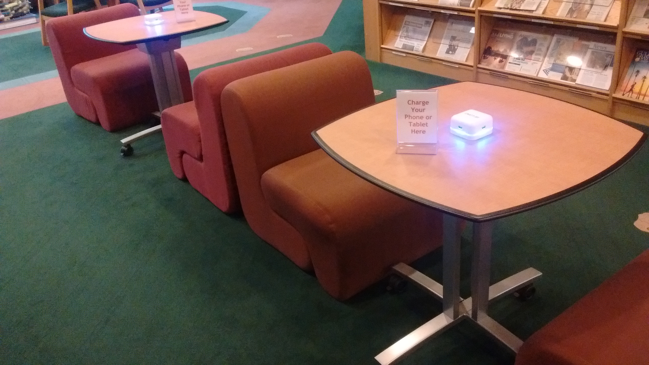 We have two charging solutions at Orion. 1. Tables with USB-only<https://www.schooloutfitters.com/catalog/product_info/pfam_id/PFAM48097/products_id/PRO63736?sc_cid=Shopzilla_PAL-RELOAD-423636-QQ-SC&gclid=Cj0KEQjwl-e4BRCwqeWkv8TWqOoBEiQAMocbPzrlqi059yA6h6tRG5KOwDGZC72mNRMEL5ikCEF7z9IaArl98P8HAQ&CA_6C15C=320012570000039328> powered via a rechargeable batteries that we charge every other night. 2. Tables outfitted with USB and regular outlets<https://www.byrne-electrical.com/desktop-power-center-charging-station> powered via outlets from the floor or wall. Eric Hayes Network & Systems Administrator Orion Township Public Library orionlibrary.org<http://www.orionlibrary.org/> w. 248-287-8019 c. 248-885-2301 From: michlib-l-bounces@mcls.org [mailto:michlib-l-bounces@mcls.org] On Behalf Of Grai, Rebecca Sent: Friday, April 22, 2016 9:27 AM To: michlib-l@mcls.org Subject: [Michlib-l] adding electrical power to a library Hi all, We are responding to our students request for more electrical outlets for their devices. The traditional wall outlets are inconvenient for how students work/study in the library. They typically do collaborative work at the larger desks. We are thinking about bringing outlets into those desks in the center of the library. The problem is that we have a concrete floor and it is difficult, and monetarily prohibitive to drill into it. So, we are looking for power sources originating from the ceiling. We are contemplating installing poles or pull down extension cords with multiple outlets on them. But, we are struggling with how this would ruin the aesthetics of our building. Does anyone have this type of ceiling drop down power source? Or, a different power source? Any ideas on how we could make them more pleasing to the eye? You all are a great resource and I look forward to hearing from you. Sincerely, Rebecca Grai Strosacker Library 989-837-4333 Northwood University - Developing the future leaders of a global free-enterprise society. You must be the change you wish to see in the world - Gandhi