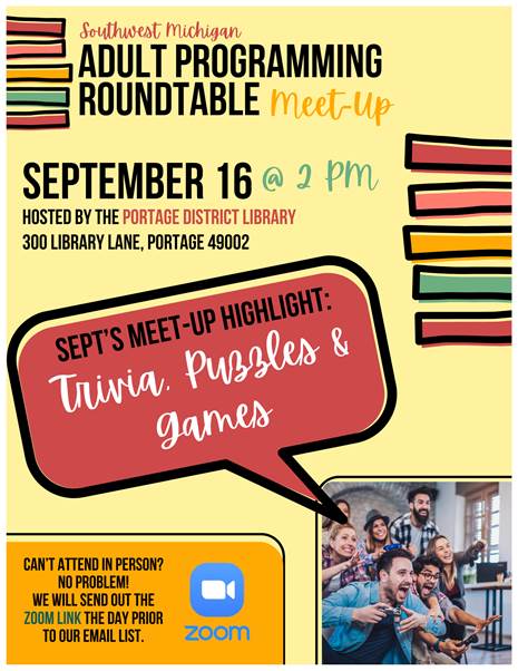 Hello All, Forgive the cross posting- Just a reminder that the Southwest Michigan Adult Programming Roundtable will be meeting on September 16th at 2PM. The Portage District Library have been generous enough to host our fall meet-up. We will be briefly discussing Trivia, Puzzle, & Game programming, before opening up the meeting to general adult programming discussion. This meeting will be held in-person, as well as via Zoom. If you would like to receive the Zoom link info, please email me your name, library, & email and I will add you to our email list. [cid:image003.jpg@01DAFDF0.2A56F050] Anna Merritt (she/her) Assistant Director / Adult Programmer / Interloan Specialist Richland Community Library 8951 Park Street Richland, MI 49083 (269) 629-9085 ZV283 https://www.richlandlibrary.org/ -- This message has been scanned by E.F.A. Project and is believed to be clean.