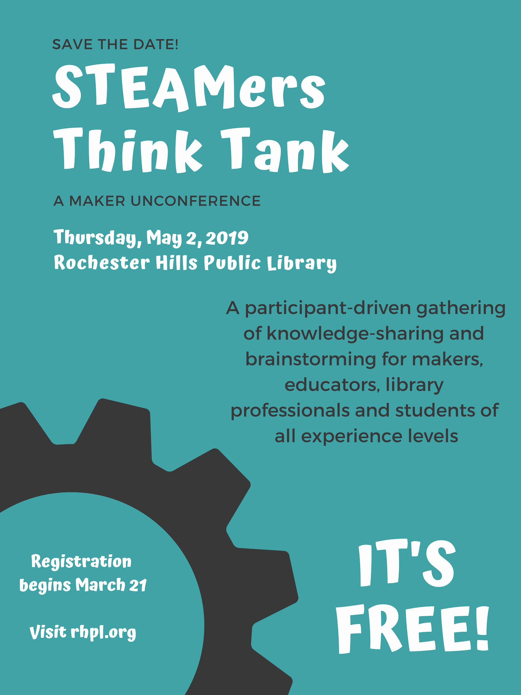 Good afternoon, all! Please save Thursday, May 2, 2019 for the very first STEAMers Think Tank: A Maker Unconference! We've all seen some iteration of "Makerspace 101" at a conference somewhere, but where do you go from there? This event is geared towards librarians, makerspace staff, and teachers at every level for knowledge sharing, professional development, and networking. This FREE event will be held at Rochester Hills Public Library, and registration will begin on Thursday, March 21. More details to come soon. We hope to see you there! -- *Jessica Parij* *Adult Services Manager* Rochester Hills Public Library 248-650-7132