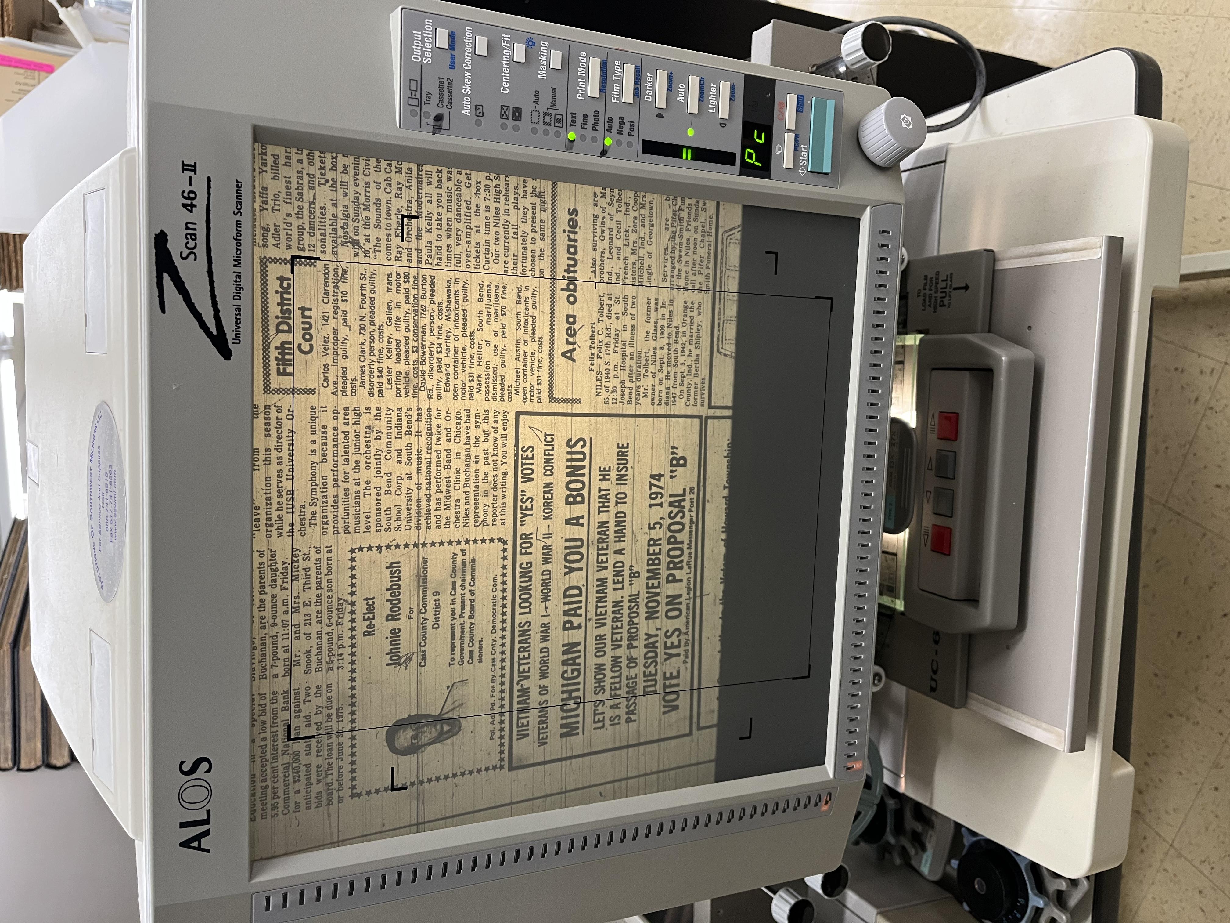 We are cleaning up our items from our storage space. We have an *ALOS Z Scan 46-II Microfilm reader/printer.* We are selling as is for *$50*. It will have to be picked up can not deliver. If interested please contact me at circulation@nileslibrary.net. Thanks Tim -- *Tim Wiggins* Cataloging & Circulation Team Leader *Niles District Library* (269) 683-8545 x104 300-ZV244 circulation@nileslibrary.net