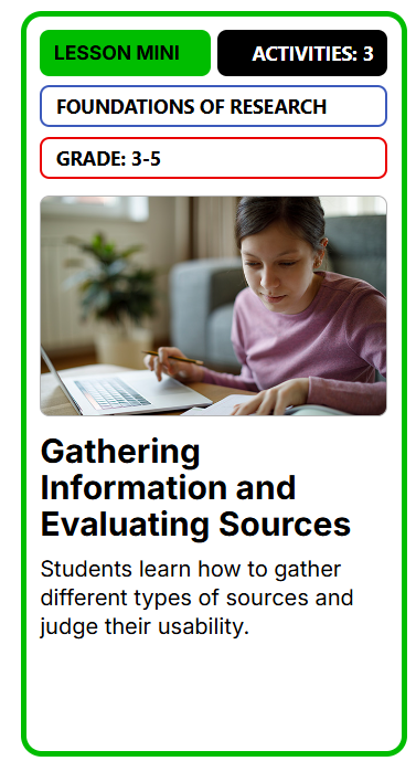 Hi Melissa, You might consider a couple of the Lesson Minis found in Teach Britannica. There is a link to all the Teach Britannica Resources at the top of any Britannica School landing page in MeL.org: * Britannica School http://widgets.ebscohost.com/prod/customerspecific/mel/auth.php?database=eb * Britannica Elementary http://widgets.ebscohost.com/prod/customerspecific/mel/auth.php?database=ebe... * Britannica Middle http://widgets.ebscohost.com/prod/customerspecific/mel/auth.php?database=ebm... * Britannica High http://widgets.ebscohost.com/prod/customerspecific/mel/auth.php?database=ebh... Click the blue, Teach Britannica logo at the top, right of the page. That will take you to a menu of options that includes Lesson Minis, Instructional Strategies, and interactive Graphic Organizers. Everything can be downloaded for easy retrieval. Among the Lesson Minis are 3 activities for Gathering Information and Evaluating Resources for Grades 3-5. (See images below) [cid:a1222d3b-6d5c-4700-8f20-a458583d85cf] [cid:1172baaf-f469-45bc-aecf-4844b13e81ad] The MeL project was made possible in part by the Institute of Museum and Library Services through the Library of Michigan. Ann Ann Kaskinen MeL Engagement Specialist, K-12 Midwest Collaborative for Library Services 517-325-5333 kaskinena@mcls.org<mailto:kaskinena@mcls.org> [cid:3d2ed42f-b889-440c-9a5f-03dad6f21632] mcls.org<https://www.mcls.org/> | Facebook<https://www.facebook.com/mcls.org> | X<https://twitter.com/mclsorg> | LinkedIn<https://www.linkedin.com/company/midwest-collaborative-for-library-services> ________________________________ From: Michlib-l <michlib-l-bounces@mcls.org> on behalf of Melissa Adkins via Michlib-l <michlib-l@mcls.org> Sent: Monday, February 10, 2025 12:19 PM To: michlib-l@mcls.org <michlib-l@mcls.org> Subject: [Michlib-l] Elementary School Information Literacy Ideas Hi All, I have an upcoming visit scheduled to teach some information literacy skills to third through fifth grade at the local elementary school. I used to just do a kind of Powerpoint presentation and show them some things, and do exaggerated silly misinformation and have them point it out. It got some laughs but I am wondering if anyone has some other things they do for this age group? I am a bit tired of the same old thing. Any ideas are appreciated! Thanks, Melissa Adkins Assistant Manager/Youth Services Librarian Detroit Public Library Bowen Branch 3648 W. Vernor Detroit, MI 48216 313-481-1540 Mon/Wed/ Sat 10am-6pm Tues/Thurs 12pm-8pm