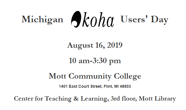 [image: 2019-06-17_1135.png] Join us on August 16 at Mott Community College for the first ever Michigan Koha Users' Day. For more information and to register, please go to the LibGuide <https://mailtrack.io/trace/link/1f76cc7d0283140d7e4799fe9738811f88d333a3?url=https%3A%2F%2Flibguides.mcc.edu%2Fkohausersday&userId=4130662&signature=7d45a5a64aa9d93b> . This is a free event. We look forward to seeing you in August on the beautiful campus of Mott Community College. With regards, Jill Sodt Director of Library Services Mott Library <https://mailtrack.io/trace/link/81cdb416937fd8bbdc38c2e78d749ebdcd615de4?url=https%3A%2F%2Fwww.mcc.edu%2Flibrary%2Flib_index.shtml&userId=4130662&signature=d12035c5e80e5470> Mott Community College 1401 East Court St, Flint, MI 48503 810-762-0415 jill.sodt@mcc.edu pronouns: she/her/hers www.facebook.com/MottLibrary <https://mailtrack.io/trace/link/3eda2c1f46519dd6ebb3a07ef3567a9b71940401?url=https%3A%2F%2Fwww.facebook.com%2FMottLibrary%2F%3Fref%3Dbookmarks&userId=4130662&signature=c7b47731a069df75>