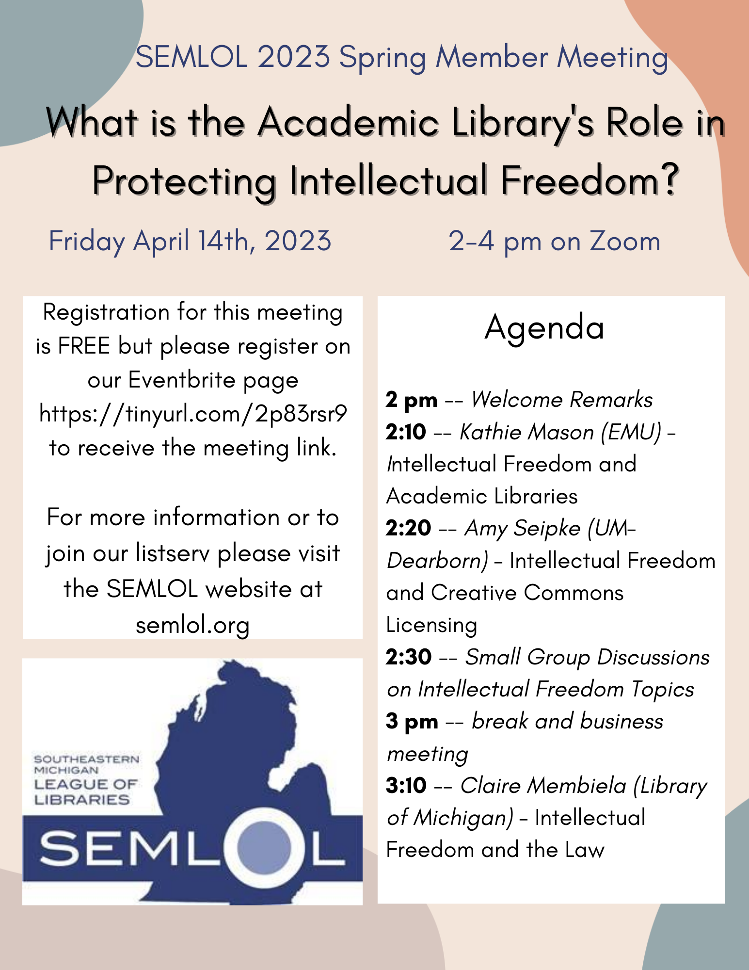 Greetings, The Southeastern Michigan League of Libraries, SEMLOL <http://www.semlol.org/>, is happy to announce our Spring meeting and professional development session “The Academic Library’s Role in Protecting Intellectual Freedom” Our meeting will be held Friday, April 14, 2023, from 2:00 p.m. to 4:00 p.m. Please follow this link <https://www.eventbrite.com/e/semlol-spring-member-meeting-tickets-570937598727> to our Eventbrite page and sign up for this online, no cost, session. During this program, our presenters (including the Library of Michigan’s Law Librarian Claire Membeila) will discuss some ways that our work in academic libraries intersects with issues of intellectual freedom. There will also be small group sessions where participants can have conversations around the specific topics of interest to them. Please see the attached flier for session descriptions and times. We welcome librarians from all types of libraries, as well as students and professionals from outside the field to attend so we can share and learn from each other how to best meet the needs of our library communities. Please forward this invitation to anyone else you think may be interested in attending. We look forward to seeing you again on April 14th! -- SEMLOL Executive Board P.S. If you are receiving this as a forward please come to https://www.freelists.org/list/semlol-l to add yourself to our mailing list in order to receive updates on our activities or better yet fill out a membership form at semlol.org to become a member. [image: The Academic Library's Role in Protecting Intellectual Freedom (1).png] :-:-:-:-:-:-:-:-:-:-:-:-:-:-:-:-:-:-:-: SEMLOL Executive Board Southeastern Michigan League of Libraries www.semlol.org