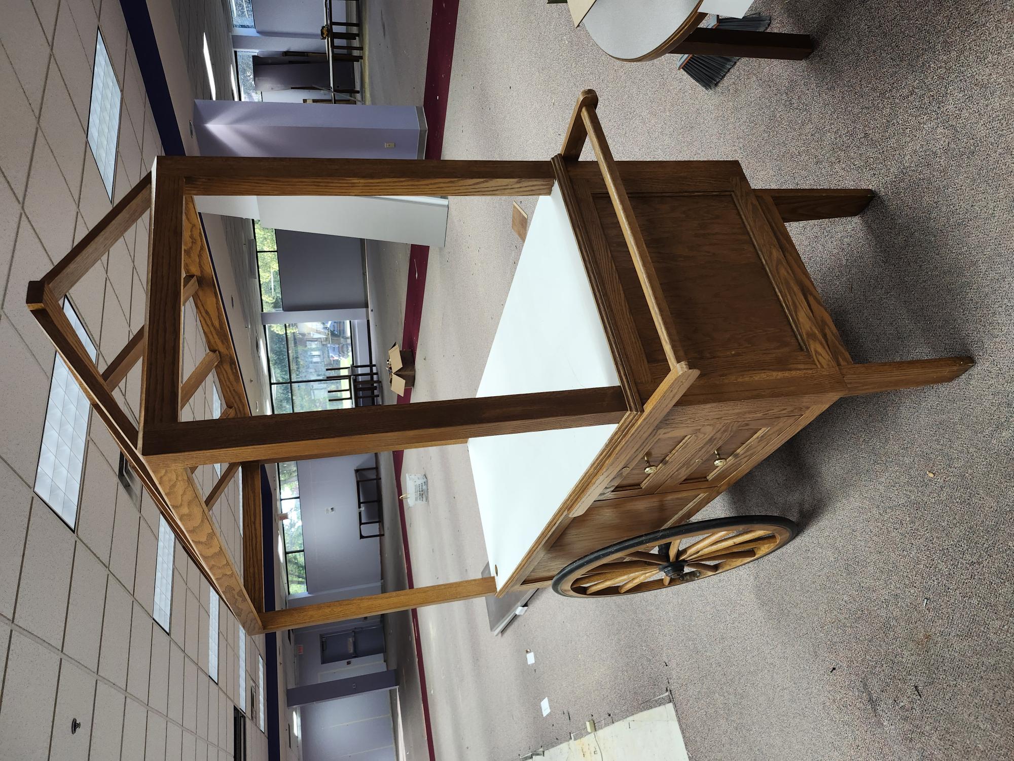 The Peddlar's Cart in the photos is free to a good library or museum home. The Friends of the Roseville Public Library purchased the Peddlar's Cart to use as a prop to promote the Friends and their activities in 1998 from the Otto Building Company in Burton, Michigan. The Friends stopped using it approximately 10 years ago and it has been in the Library's (dry) basement since. It is in good shape with some scarring on the white laminated surface. It has two small drawers and a cubby that lock (keys are are available) for storage. These carts from Otto Building were sold to other libraries across the country for the same "display" purpose including the Alexandrian Public Library in Indiana. I have a folder that includes the original invoice and blueprints for the cart. Measurements: length - 60" height to the top of the slatted canopy - 79" width - 28" The cart is very heavy and does not move easily, however you can move it short distances safely. The Friends rarely moved it from the lobby. I could not see a way to easily remove the four canopy supports and the canopy for transport. It may have to be transported in one piece. You must be able to move it into your vehicle as we may not always have assistance available. The blueprints and a copy of the invoice with the name of the manufacturer go with the cart. The Roseville Public Library building is currently being prepared for renovation and the cart must go in preparation for contractors to begin the demolition of the interior. If you would like the cart, it must be picked up by July 31. I'll send a message if/when the cart is claimed. Best, Jackie Jacalynn Harvey Director Roseville Public Library 29777 Gratiot Avenue Roseville, MI 48066 586-447-4550 rosevillelibrary.org Sent from my T-Mobile 5G Device Get Outlook for Android<https://aka.ms/AAb9ysg>