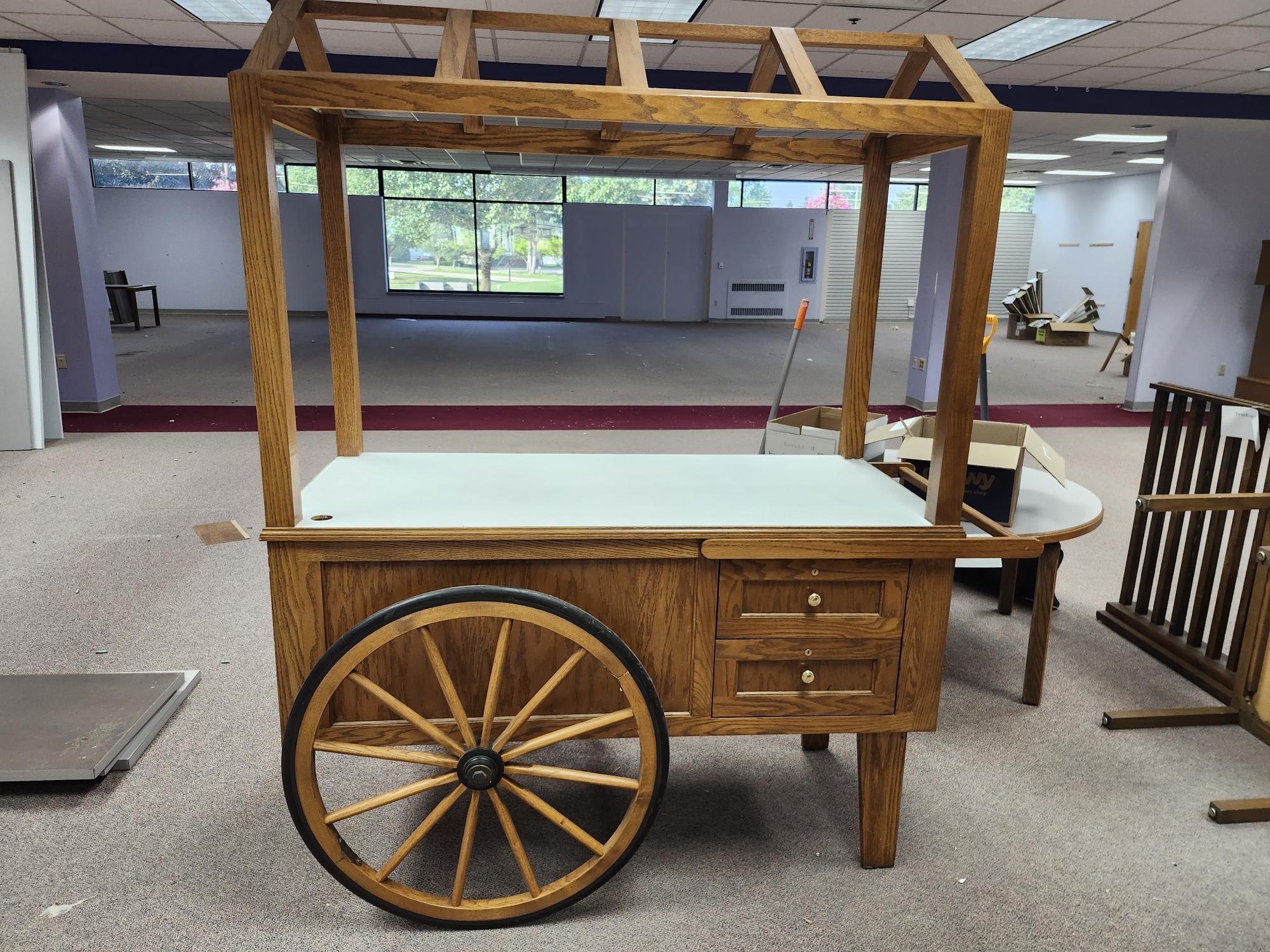 The Friends of the Roseville Public Library purchased the Peddlar's Cart to use as a prop to promote the Friends and their activities in 1998 from the Otto Building Company in Burton, Michigan. The Friends stopped using it approximately 10 years ago and it has been in the Library's (dry) basement since. It is in good shape with some scarring on the white laminated surface. It has two small drawers and a cubby that lock (keys are are available) for storage. These carts from Otto Building were sold to other libraries across the country for the same "display" purpose including the Alexandrian Public Library in Indiana. I have a folder that includes the original invoice and blueprints for the cart.