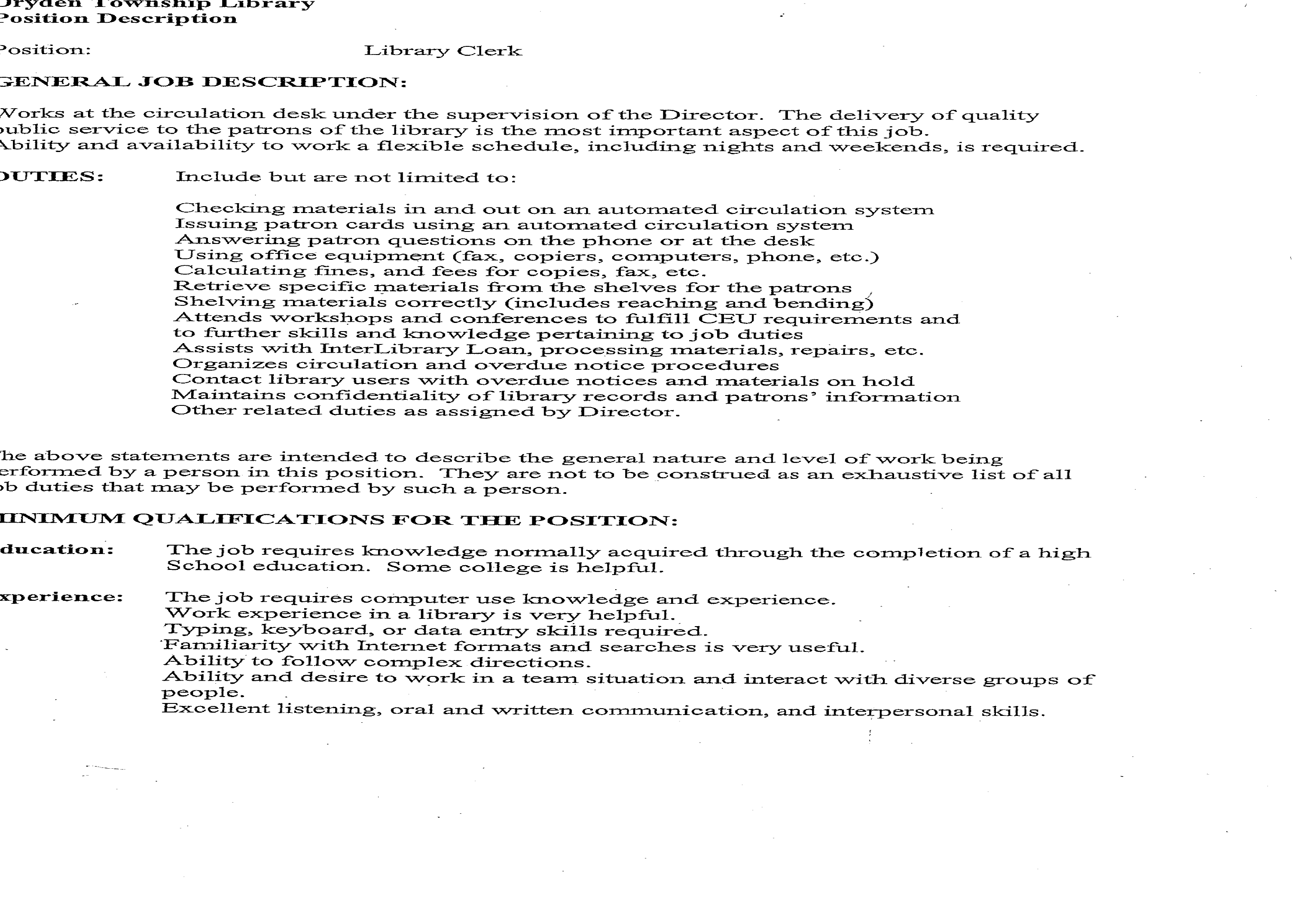 Library Clerk The Dryden Township Library is seeking a part-time Library Clerk for the circulation desk. Requires high school diploma, excellent customer service skills, use of Internet and Windows based programs, high degree of organization, and dependable. Library experience is preferred, but willing to train. Schedule includes one evening and Saturday hours, 18-25 hours a week. Please send resume to Dryden Township Library, 5480 Main Street, Po Box 280, Dryden, MI 48428, Email Resume: drydentownshiplibrary@gmail.com, or fax to 810-796-2634. See attached Job Description. Diane Moyer, Director Dryden Township Library 5480 Main St. Dryden, MI 48428 810-796-3586 d.moyer@vlc.lib.mi.us
