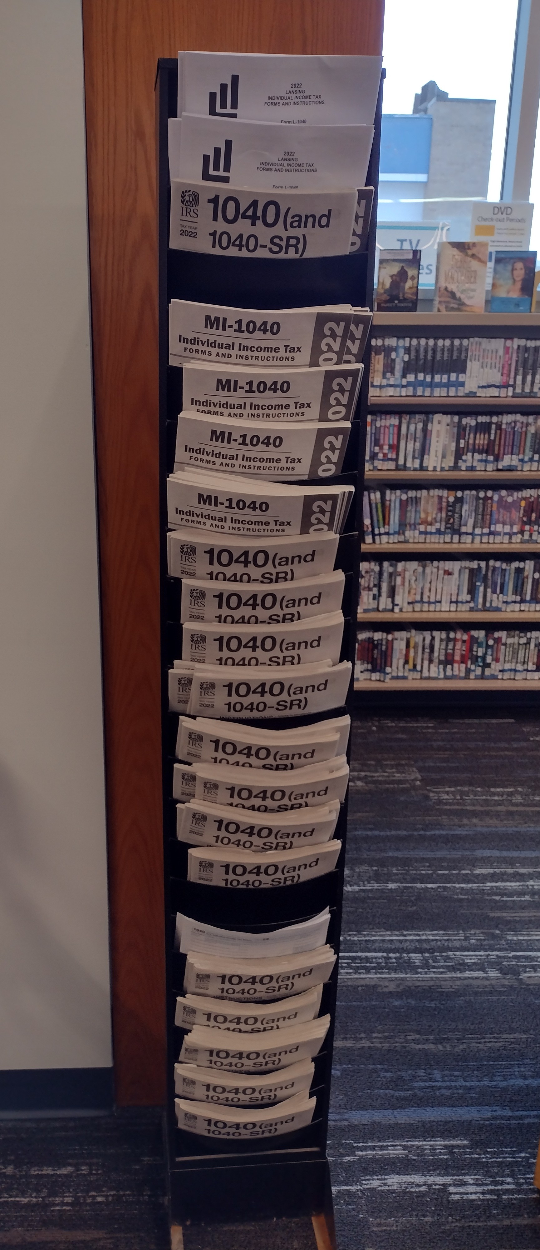 Hi, We have 2 tax form towers or magazine towers -- you decide! Black metal, 10" x 66" tall. Free to a good home. You must pick up. thanks, lise -- Lise Mitchell, Library Director director@gladl.org 517-622-3550 Grand Ledge Area District Library 131 E. Jefferson Grand Ledge, MI 48837