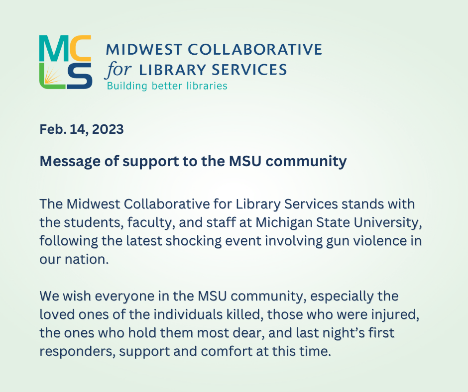 [cid:0f33971c-4506-4342-ada5-62bbe1809d57] The Midwest Collaborative for Library Services stands with the students, faculty, and staff at Michigan State University, following the latest shocking event involving gun violence in our nation. We wish everyone in the MSU community, especially the loved ones of the individuals killed, those who were injured, the ones who hold them most dear, and last night’s first responders, support and comfort at this time. [cid:bad25872-25a6-4851-91ed-9d176d8e6d90] mcls.org<https://www.mcls.org/> | Facebook<https://www.facebook.com/mcls.org> | Twitter<https://twitter.com/mclsorg> | LinkedIn<https://www.linkedin.com/company/midwest-collaborative-for-library-services>