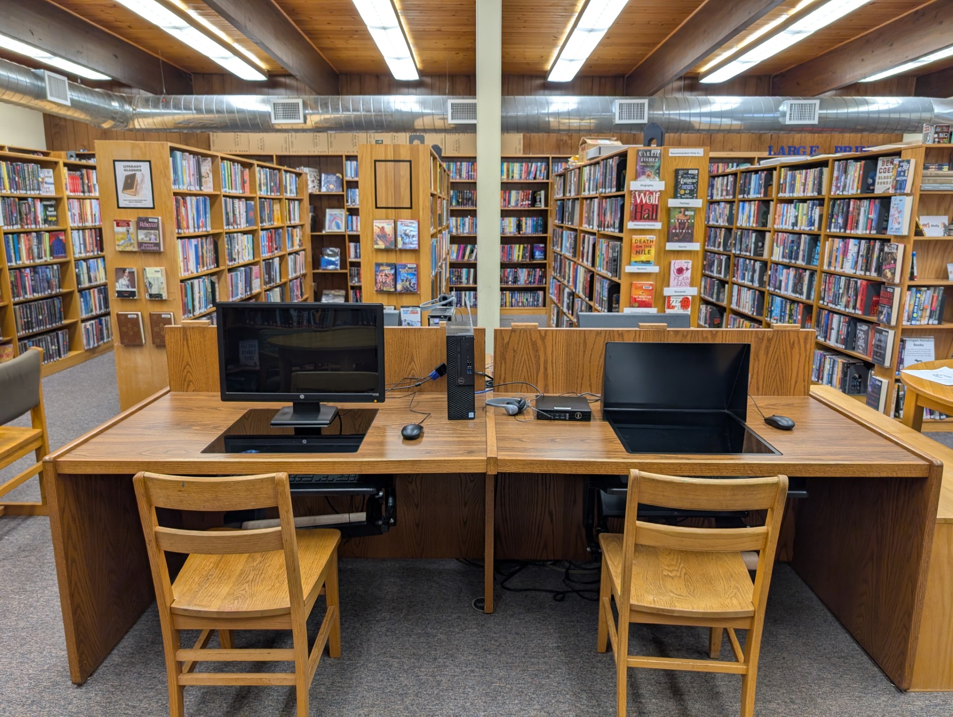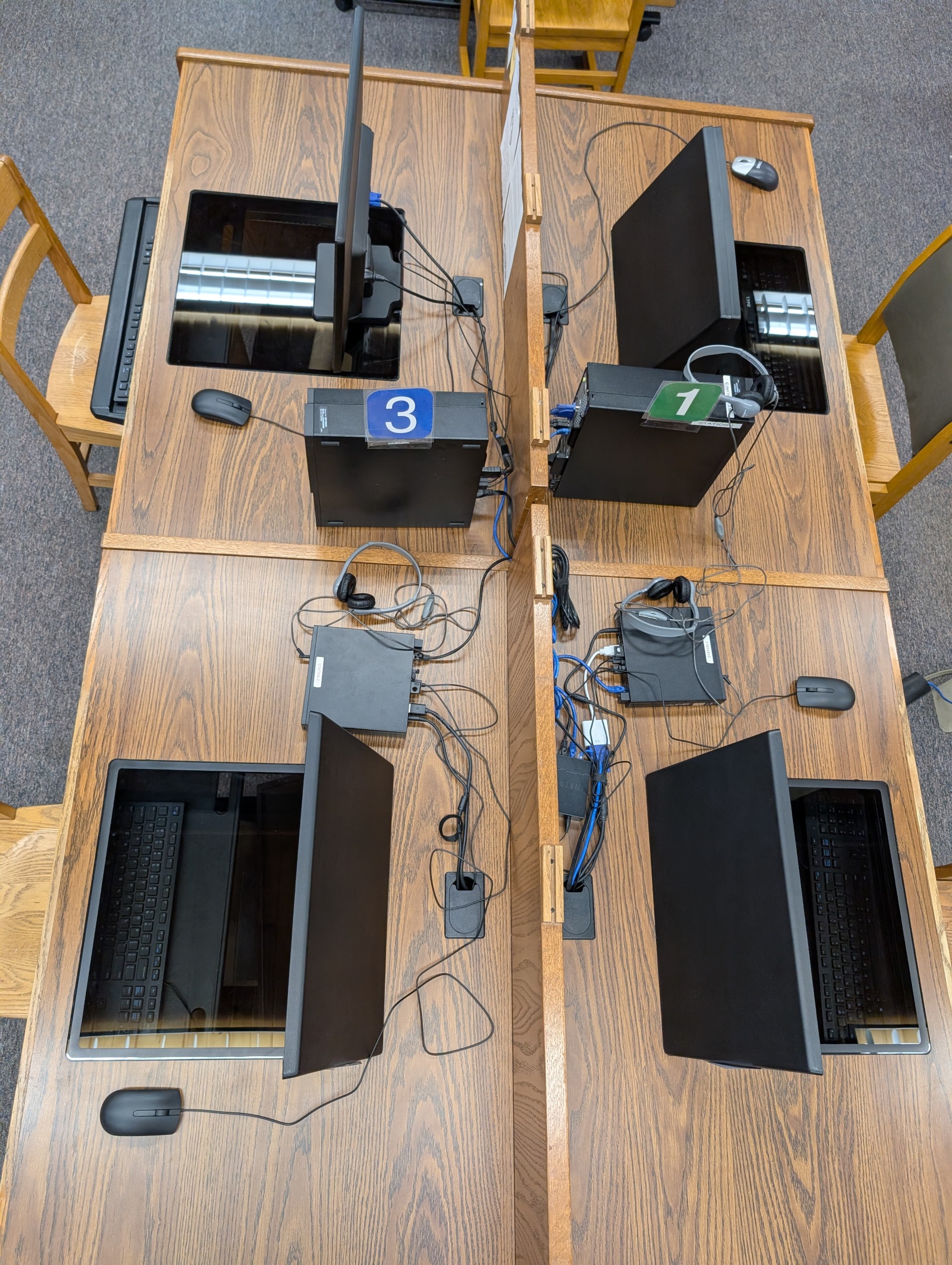 Hi All, This large, four-person computer workstation needs a new home! Computers and chairs not included. It is in very nice condition, but our space is quite limited and we are switching to something smaller. It's been here longer than I have, but I was told we originally got it from another library, so let the tradition continue! Details: Unique design makes it ideal for those who desire privacy Removable hoods can be set over the glass Keyboard trays slide out from under the desk Glass panels are removable (see attached picture) Computer monitors sit in a little nest under the desk and are viewed through the glass. As pictured, you can also place the monitors above the desk in the usual fashion if preferred. We are happy to include the pool noodles to prevent bumped knees We believe there was originally a plastic divider, but we do not have it Measurements: Total table size: 60" x 99.5 " Height: 27" to bottom of desk, 28.5" to top of desk Table divider height: 10" Each workspace is 48" wide and 28.75" deep The glass windows are 18" x 18" Pick up in Dimondale (near Lansing). Please email/call if you are interested or have any questions. Thanks! Kate Gillham Director Dorothy Hull Library - Windsor Township 405 W. Jefferson St. Dimondale, MI 48821 517-646-0633 Visit us at https://windsor-township.ploud.net/