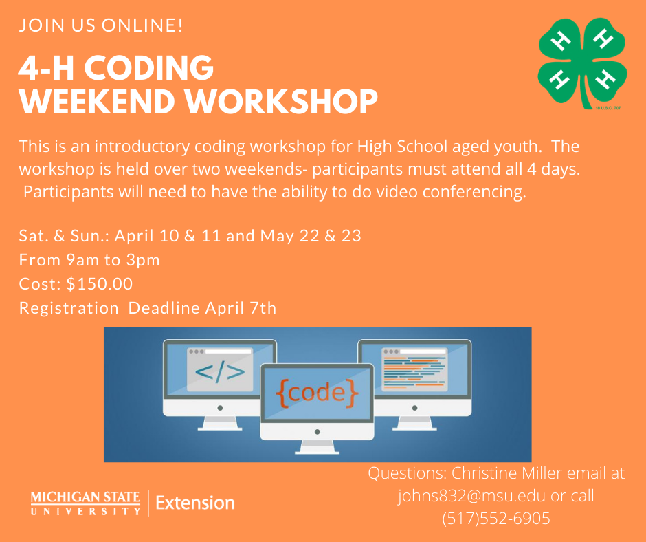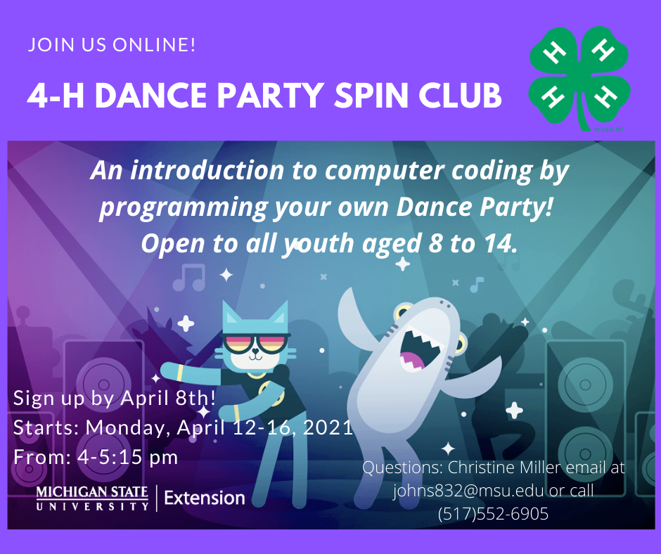 Feel free to share the following youth & teen programs with families in your library: 4-H Coding Weekend Workshop-An Intro to Coding: Saturday and Sunday April 10 & 11, and May 22 & 23, 2021- Registration DEADINE - Registration closes Wednesday, April 7th @ Midnight! The 4-H Coding Weekend Workshop will help you discover your passion for technology and enable you to continue practicing throughout high school. This course includes 4-days (2 weekends) of virtual instruction to hone your coding skills. Whether you have prior computer coding knowledge, or have never even thought about it, you will gain valuable coding experience and skills. By the end of the workshop, you will learn to develop with your own tech ideas; design and code a website from scratch! Specific coding languages taught during the program include HTML, CSS, JS, Ruby, Rails, and Github. WHERE: Virtually via Zoom WHO: Youth currently in grades 9-12. COST: The cost to attend this four-day workshop (2 weekends) is $150 and includes tech support and program fees. MATERIALS REQUIRED: Computer with internet and the ability to do video conferencing (microphone and webcam). FOR MORE INFORMATION, TO REGISTER, AND PAY: https://events.anr.msu.edu/4HCodingWeekendWorkshop/<https://gcc02.safelinks.protection.outlook.com/?url=https%3A%2F%2Fevents.anr.msu.edu%2F4HCodingWeekendWorkshop%2F&data=04%7C01%7CLancasterC5%40michigan.gov%7C368e3ae6522a4b9253fb08d8ed3a0139%7Cd5fb7087377742ad966a892ef47225d1%7C0%7C0%7C637520180708351348%7CUnknown%7CTWFpbGZsb3d8eyJWIjoiMC4wLjAwMDAiLCJQIjoiV2luMzIiLCJBTiI6Ik1haWwiLCJXVCI6Mn0%3D%7C1000&sdata=wiYiInSA7bIsSJlAc3V0ed4F5JTPp9178DFDiqaYu00%3D&reserved=0> Space is limited to 20 participants. This workshop is offered in collaboration with CodeNow and Code Nation. Questions? Contact Christine Miller at MSU Extension at 517-552-6905 or email johns832@msu.edu<mailto:johns832@msu.edu>. 4-H Dance Party SPIN Club will begin on Monday, April 12th and end Friday, April 16th, registration closes on April 8th. This club will meet virtually every day from 4-5:15pm EST. Explore computer coding by programming your own Dance Party! This is an introduction to computer coding. Participants will need access to the internet to go to the coding site. This 4-H SPIN Club is FREE and OPEN to 4-H and non-4-H members ages 8 to 14. For more information and to register, please visit: https://events.anr.msu.edu/4HDancePartySPINClub/<https://gcc02.safelinks.protection.outlook.com/?url=https%3A%2F%2Fevents.anr.msu.edu%2F4HDancePartySPINClub%2F&data=04%7C01%7CLancasterC5%40michigan.gov%7C368e3ae6522a4b9253fb08d8ed3a0139%7Cd5fb7087377742ad966a892ef47225d1%7C0%7C0%7C637520180708361303%7CUnknown%7CTWFpbGZsb3d8eyJWIjoiMC4wLjAwMDAiLCJQIjoiV2luMzIiLCJBTiI6Ik1haWwiLCJXVCI6Mn0%3D%7C1000&sdata=m%2FrEHIwcUAo91Us9AzJrwRSplGZvKtZZuNZY9bPJXrg%3D&reserved=0>. This 4-H SPIN Club will meet virtually via Zoom<https://gcc02.safelinks.protection.outlook.com/?url=https%3A%2F%2Fzoom.us%2Fdownload&data=04%7C01%7CLancasterC5%40michigan.gov%7C368e3ae6522a4b9253fb08d8ed3a0139%7Cd5fb7087377742ad966a892ef47225d1%7C0%7C0%7C637520180708361303%7CUnknown%7CTWFpbGZsb3d8eyJWIjoiMC4wLjAwMDAiLCJQIjoiV2luMzIiLCJBTiI6Ik1haWwiLCJXVCI6Mn0%3D%7C1000&sdata=cjwIGNwgVtj5pXuAjSYrRBbgeqhE03g0wUm8%2FNx8214%3D&reserved=0> (both computer and smartphone accessible). Zoom link information will only be sent to event registrants that complete their 4-H Online enrollment by April 8th (Club is listed under Livingston County - SPIN Club Dance Party Club). Questions? Contact Christine Miller at MSU Extension at 517-552-6905 or email johns832@msu.edu<mailto:johns832@msu.edu>. Thank you and have a great day, Christine Miller MSU Extension Livingston County 517-552-6905 (office) 517-375-6337 (cell) johns832@msu.edu<mailto:johns832@msu.edu> Cathy Lancaster Youth Services Coordinator Library of Michigan 702 W. Kalamazoo St. Lansing, MI 48915 My Pronouns: She/Her - See www.mypronouns.org<http://www.mypronouns.org/> to learn more. LancasterC5@michigan.gov<mailto:LancasterC5@michigan.gov> | 517-335-8129 | www.mi.gov/libraryofmichigan<http://www.mi.gov/libraryofmichigan> Follow us: Facebook<https://www.facebook.com/libraryofmichigan/> | Twitter<https://twitter.com/libraryofmich> | Instagram<https://www.instagram.com/libraryofmichigan/>