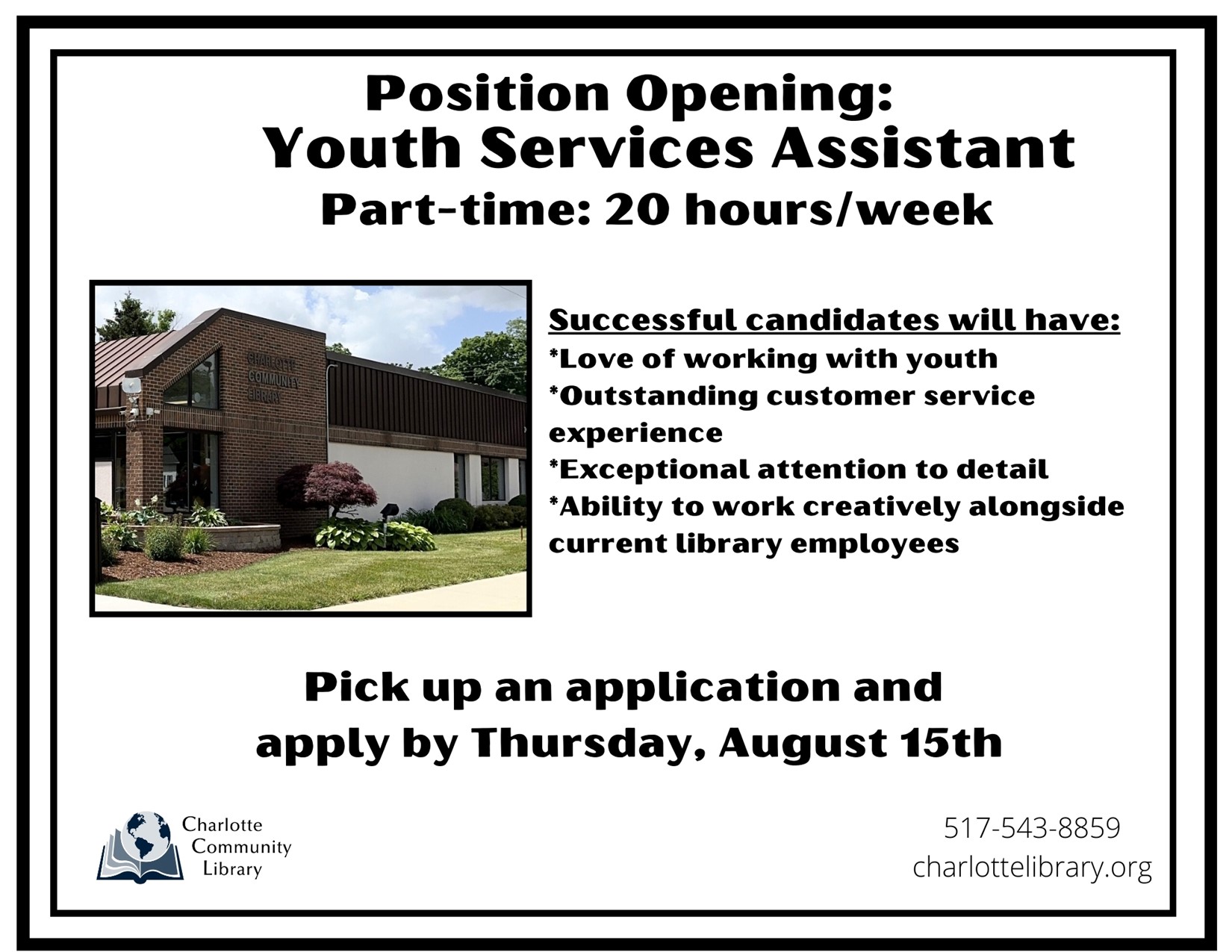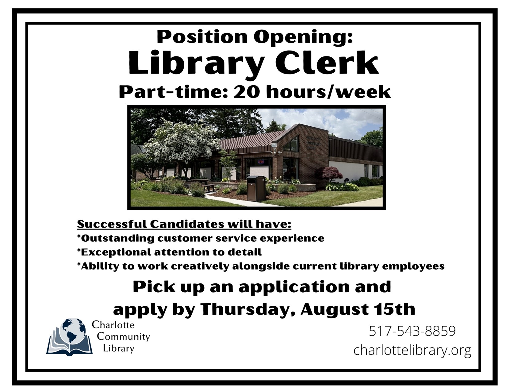 Charlotte Community Library is hiring! Due to a couple of staff members leaving at the end of the summer, we are seeking applicants for two part-time positions. Applications are available on our website (https://charlottelibrary.org/wp-content/uploads/2024/07/Fillable-CCL-Employm...) or physical copies at the Library's circulation desk. Please drop off or email (reynoldsk@charlottelibrary.org<mailto:reynoldsk@charlottelibrary.org>) your application. Deadline for applications will be Thursday, August 15th. Youth Services Assistant Library Clerk Part-time: 20 hours/week Part-time: 20 hours/week [cid:image001.jpg@01DAE8E4.C767FF40] [cid:image002.jpg@01DAE8E4.C767FF40] Thank you! Sara Horn Adult Services/ Local History Librarian Charlotte Community Library 517-543-8859 226 S. Bostwick Charlotte, MI 48813
