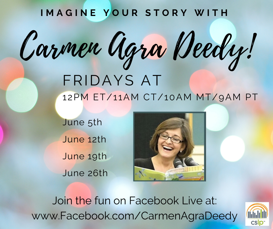 CSLP has announced that Carmen Agra Deedy<https://www.facebook.com/carmenagradeedy> is the 2020 National Summer Reading Champion! Be sure to share out the information on her live stories, Fridays at Noon (ET) in June. #ImagineYourStory<https://www.facebook.com/hashtag/imagineyourstory?__eep__=6&__cft__%5b0%5d=AZURh6IV0f_yzWdb72IoTlvn1RkIpCkUs95HLABTXGmcs0bqzCTmixTuY8JP6O8YDvYaGn1GSx4Hc6_ip5yIYJcNRBXZL6YzKeXfKsYxZ0VAQJrlRGOZd8ARMWYtFiyAE2HObtB9BCv9CLNYuGjqWtNZ36hbFO1mZ3PxeZlmbO5JpQ&__tn__=*NK-R> Please feel free to use the graphic<https://www.facebook.com/cslpreads/posts/2985605921555490> (also attached) to share the information with your public. Thank you, Cathy Lancaster Youth Services Coordinator Library of Michigan 702 W. Kalamazoo St. Lansing, MI 48915 LancasterC5@michigan.gov<mailto:LancasterC5@michigan.gov> | 517-335-8129 | www.mi.gov/libraryofmichigan<http://www.mi.gov/libraryofmichigan> Follow us: Facebook<https://www.facebook.com/libraryofmichigan/> | Twitter<https://twitter.com/libraryofmich> | Instagram<https://www.instagram.com/libraryofmichigan/> You have the power to shape your future, and the future of all children, by counting everyone in your home in the 2020 Census<https://gcc01.safelinks.protection.outlook.com/?url=https%3A%2F%2Fmy2020census.gov%2F&data=02%7C01%7CLancasterC5%40michigan.gov%7C5760deb8252c447b2e9208d8063111c0%7Cd5fb7087377742ad966a892ef47225d1%7C0%7C0%7C637266155164811130&sdata=IijbGoasIVThg8CSYX2Cpqtef57KqR6sRc9KZA%2F3XGc%3D&reserved=0>. [A close up of a sign Description automatically generated]