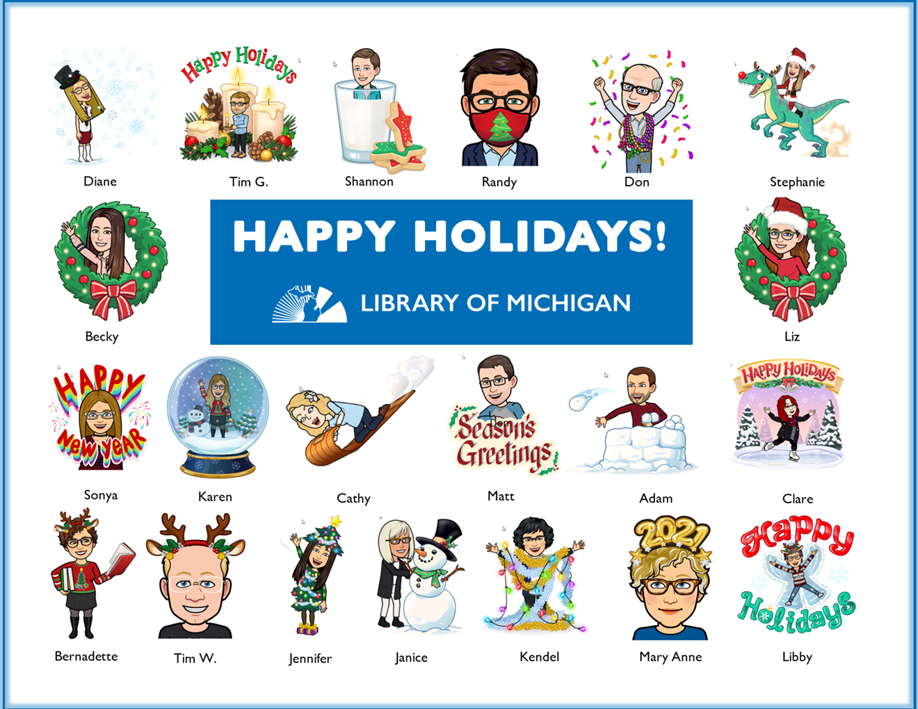 Happy Holidays to everyone at the Library of Michigan! I love the holiday greeting. Thank you all for your help, assistance, expertise and leadership during this unprecedented time. I don't think that I would have made it through without the Library of Michigan staff. What a year it has been; one that we'll remember for a long time. Happy Holidays to everyone in Library Land! I'm hoping for a healthy and safe 2021 for all of you. Tina
