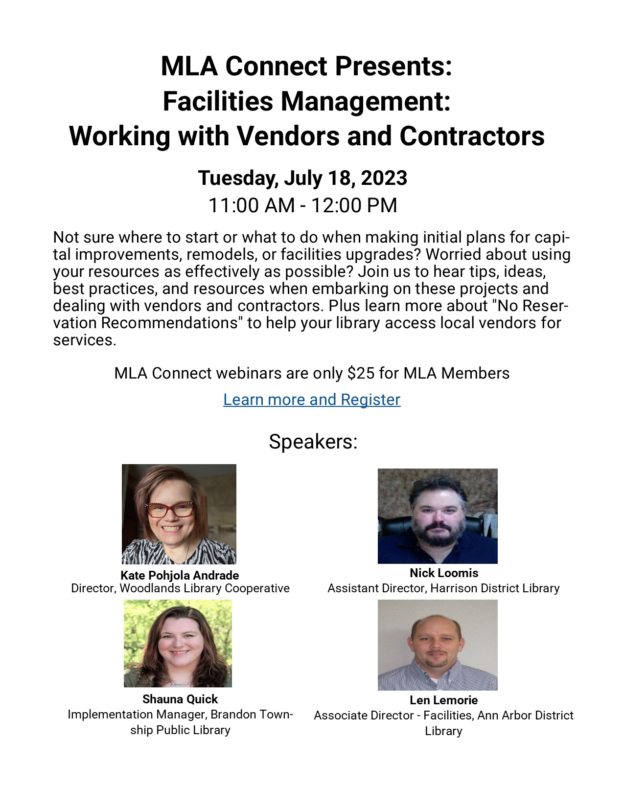 MLA Connect Presents: Facilities Management: Working with Vendors and Contractors Tuesday, July 18, 2023 11:00 AM - 12:00 PM MLA Connect webinars are only $25 for MLA Members Learn more and Register <https://www.milibraries.org/index.php?option=com_jevents&task=icalevent.detail&evid=183> [image: MLA Facilities Flyer.jpg]