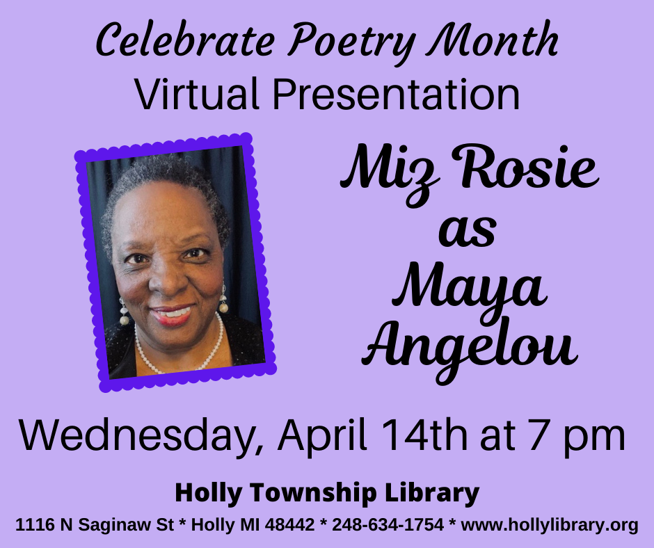 Hello Everyone, Please join us for a virtual event this *Wednesday, 4/14/21 at 7:00 pm* for *Maya Angelou Poetry with Miz Rozie* (Rozie Chapman). Please register on our website at https://hollylibrary.org/events. The Zoom link will be emailed the morning of the event. Please share with your library community and staff. Thanks, Tina -- Tina Marie Russette Adult/Teen Services Manager Holly Township Library 1116 N. Saginaw St. Holly, MI 48442 248-634-1754