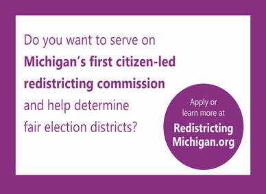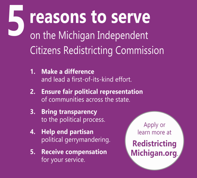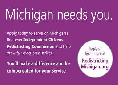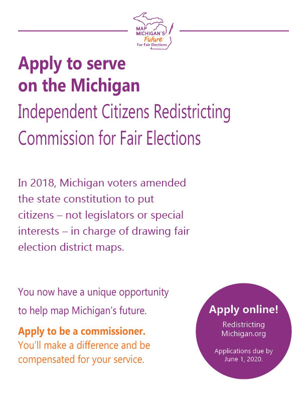 Hello. The Secretary of State's Office is once again requesting the assistance of libraries to help raise public awareness. Today's request is about the opportunity for Michiganders to serve on the first-ever Independent Citizens Redistricting Commission. We hope you will share the following newsletter/website message and social media messages through your own communication channels. I've also attached a flyer that we're hoping you will consider posting inside your building. NOTE: Some residents may need to use library computers when applying to serve on the commission and we are so grateful libraries offer this community service. Should anyone approach your staff with questions about the commission, please direct them to RedistrictingMichigan.org<http://www.redistrictingmichigan.org/> where we have provided a wealth of information about what it means to be a commissioner. As always, thank you so much for helping us raise public awareness. Newsletter/website message Apply now to make our elections fair Now through June 1, 2020, you can apply<http://www.redistrictingmichigan.org> to serve as one of 13 commissioners on the first-ever Michigan Independent Citizens Redistricting Commission. Last November, Michigan voters decisively supported the "Voters Not Politicians" constitutional amendment that makes a commission of 13 randomly-selected citizens - not elected politicians, consultants or lobbyists - responsible for drawing fair and representative district lines for the Michigan Senate, Michigan House of Representatives and U.S. Congress. The commission is a historic opportunity for Michigan voters to draw electoral maps and give us more impartial elections. All eligible Michigan citizens are encouraged to apply to serve on the commission, which does not require any special skills or expertise. The constitution simply requires that each commissioner performs his or her duties impartially and with integrity. The application takes about 15 minutes to complete, and commissioners will be compensated about $40,000 for their service. Commissioners will be randomly selected from the pool of eligible applicants in the summer of 2020 and will gather input from the public as well as census data to determine electoral district maps which will take effect for the 2022 elections. You can apply today or learn more at RedistrictingMichigan.org<http://www.redistrictingmichigan.org>. Social Media Posts Twitter Have you heard? Applications are open for the MI Independent Citizens Redistricting Commission! Apply today: RedistrictingMichigan.org<http://www.redistrictingmichigan.org> #MapMichigansFuture @MichSoS Do you want to help end partisan gerrymandering? Do you believe in transparent and fair government? Apply to serve on the MI Independent Citizens Redistricting Commission today at RedistrictingMichigan.org<http://www.redistrictingmichigan.org> to #MapMichigansFuture @MichSoS If you want to make a difference in Michigan's democracy, consider applying to serve on the Independent Citizens Redistricting Commission. You can learn more and apply today at RedistrictingMichigan.org<http://www.redistrictingmichigan.org> #MapMichigansFuture Facebook For the first time ever, the power to draw fair and representative election districts in Michigan will be in the hands of citizens and you can be part of it. Apply today to serve on the Michigan Independent Citizens Commission - no special expertise necessary. Help map Michigan's future. You'll make a difference and be compensated for your service. Visit RedistrictingMichigan.org<http://www.redistrictingmichigan.org> today! @MichSoS Last November millions of Michigan voters amended our constitution to end partisan gerrymandering. Now is the time to apply and participate to #MapMichigansFuture. Visit RedistrictingMichigan.org<http://www.redistrictingmichigan.org> today! @MichSoS Sample Social Media Graphics Please tag us on Twitter at @MichSoS, Instagram at @michigansos and Facebook at @michigansos. [A screenshot of a cell phone Description automatically generated] [A screenshot of a cell phone Description automatically generated] [A screenshot of a cell phone Description automatically generated] [A screenshot of a cell phone Description automatically generated] Cathleen P. Simlar Communications Specialist Michigan Department of State Office: (517) 335-3263 Cell: (248) 761-7145 Email: SimlarC@Michigan.gov<mailto:SimlarC@Michigan.gov> Join My Professional network on LinkedIn<blocked::http://www.linkedin.com/pub/cathleen-simlar/18/798/235>