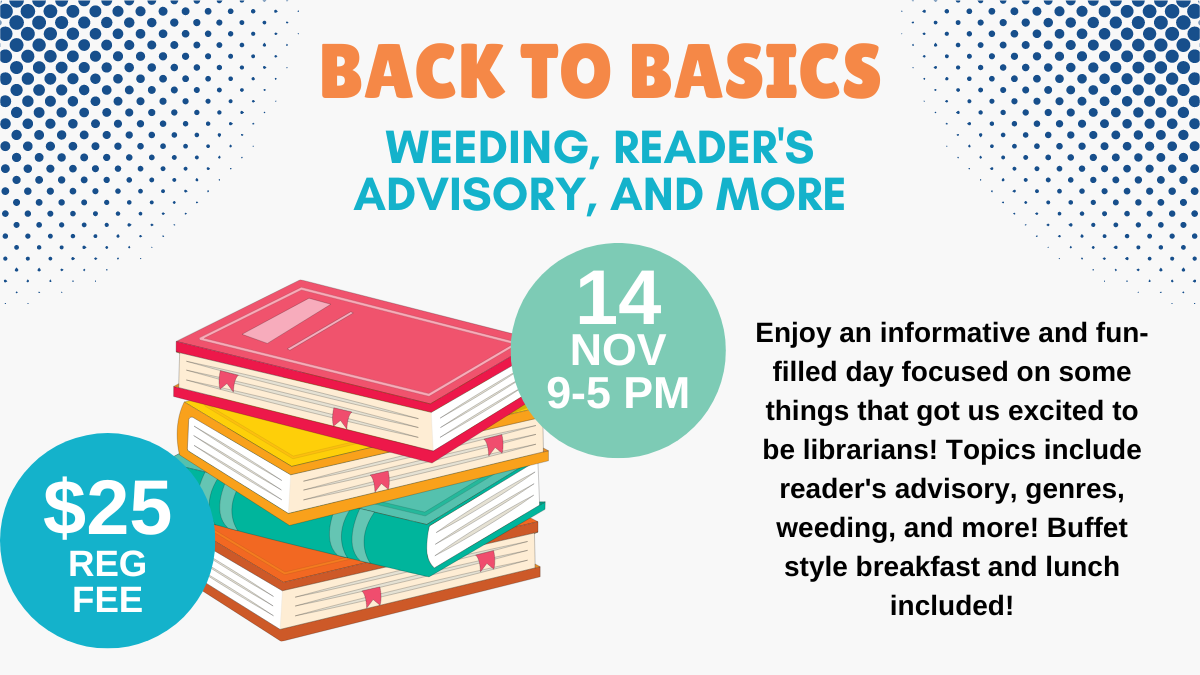 Hi Michigan Library Land, Registration is now open for Lakeland Library Cooperative's Back to Basics event, which will cover topics such as weeding, reader's advisory, and genres. Buffet style breakfast and lunch included! See attached flyer and registration page for more details. Note that the $25 registration fee is due prior to the event and is nonrefundable. Note: There are 17 spots open and registration is first come, first served. Cost: $25 registration fee Date and Time: November 14, 9 to 5 Location: 310 Pearl St. NW, Grand Rapids, MI 49504 (Downtown Grand Rapids Holiday Inn) Registration: [ https://events.getlocalhop.com/back-to-basics-weeding-readers-advisory-and-m... | Click Here to Register ] Amber McLain (she/her) Member Services Manager Phone: 616-482-9600