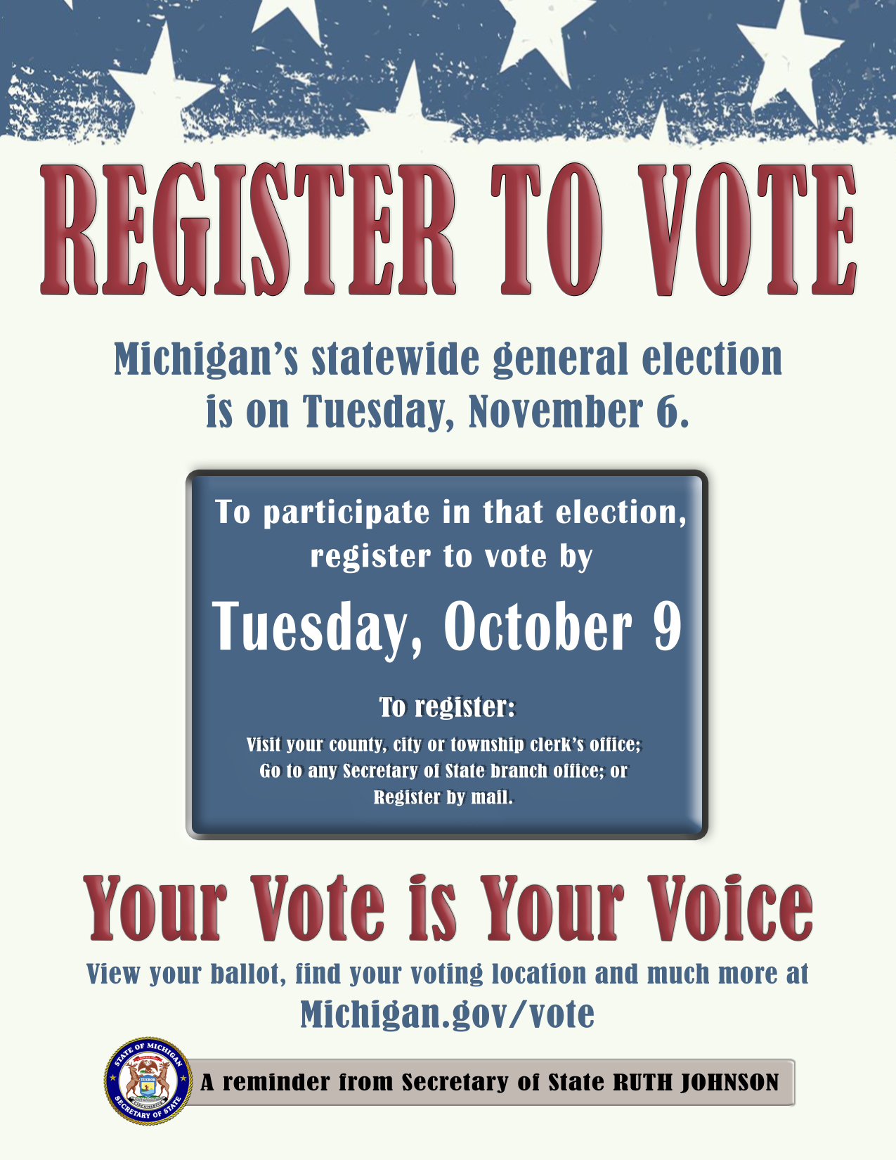 Hello. We're hoping libraries across Michigan can once again help us remind the public about the upcoming deadline for voter registration (Oct. 9). If possible, please post the attached flyer where the public will see it and include it on your website. In addition, we hope you will consider sharing the following messages in any public communication channels your library provides, including social media and newsletters. I've also attached a simple voter registration icon that can be included. Website, Email or Facebook Message: Voter Registration Deadline Nears for November General Election Anyone wishing to participate in the upcoming November election has until Tuesday, October 9 to get registered. Eligible voters can register by mail or in person at their county or local clerk's office, as well as any Secretary of State branch office. To check your voter registration status or to view your ballot ahead of time, visit Michigan.gov/vote<http://www.michigan.gov/vote>. . Twitter Message: Want to vote in Michigan's November election but aren't registered? Time is running out. Registration deadline is Oct 9. mi.gov/vote<http://www.michigan.gov/vote> @MichSOS Thank you so much for your help in sharing this important reminder. With much gratitude, Cathleen Simlar Cathleen P. Simlar Communications Specialist, Executive Office Michigan Department of State Office: (517) 373-9080 Cell: (248) 761-7145 Email: Simlarc@michigan.gov<mailto:Simlarc@michigan.gov> Join My Professional network on LinkedIn<blocked::http://www.linkedin.com/pub/cathleen-simlar/18/798/235> [Description: Description: Description: SOS logo small] <http://www.michigan.gov/sos> STAY CONNECTED: [Description: Description: Description: Facebook logo]<http://www.facebook.com/MichiganSoS> [Description: Description: Description: Twitter logo] <https://twitter.com/michsos> [Description: Description: Description: YouTube logo] <http://www.youtube.com/michsosoffice> [Description: Description: Description: GovDelivery logo] <https://public.govdelivery.com/accounts/MISOS/subscriber/new>