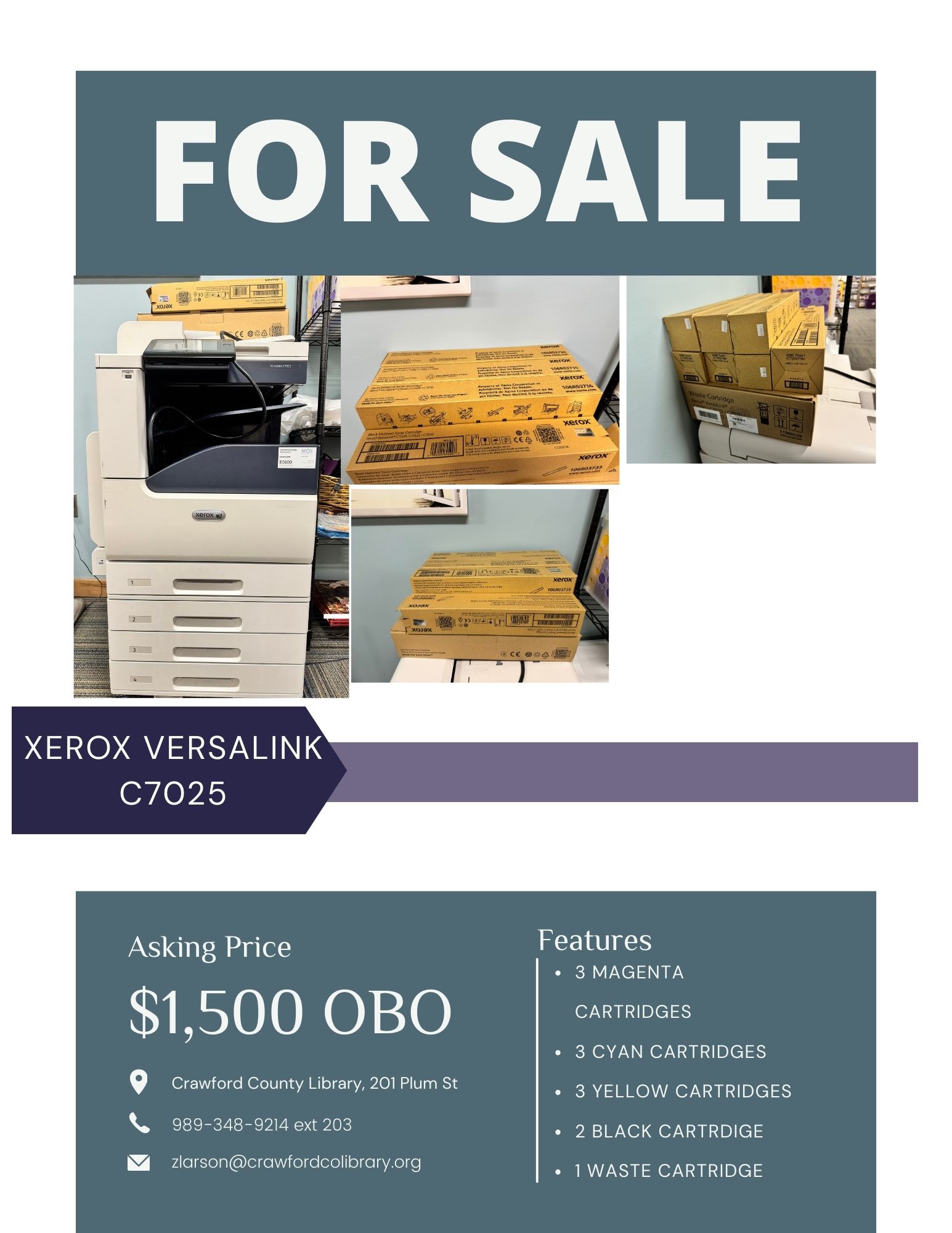 Please, contact me if you're interested and/or have any questions. Pick up is required. Zac Larson Pronouns: He/Him Administration Collection Development Librarian Staffing and Scheduling Devereaux Memorial Library 201 Plum Street[http://www.crawfordco.lib.mi.us/dnn/portals/0/devsm.jpg] Grayling, Michigan 49738 Phone: 989-348-9214 Ext. 203 Fax: 989-348-9294 [cid:c26a859c-84fb-4a7d-8cbd-f15e515f920d]