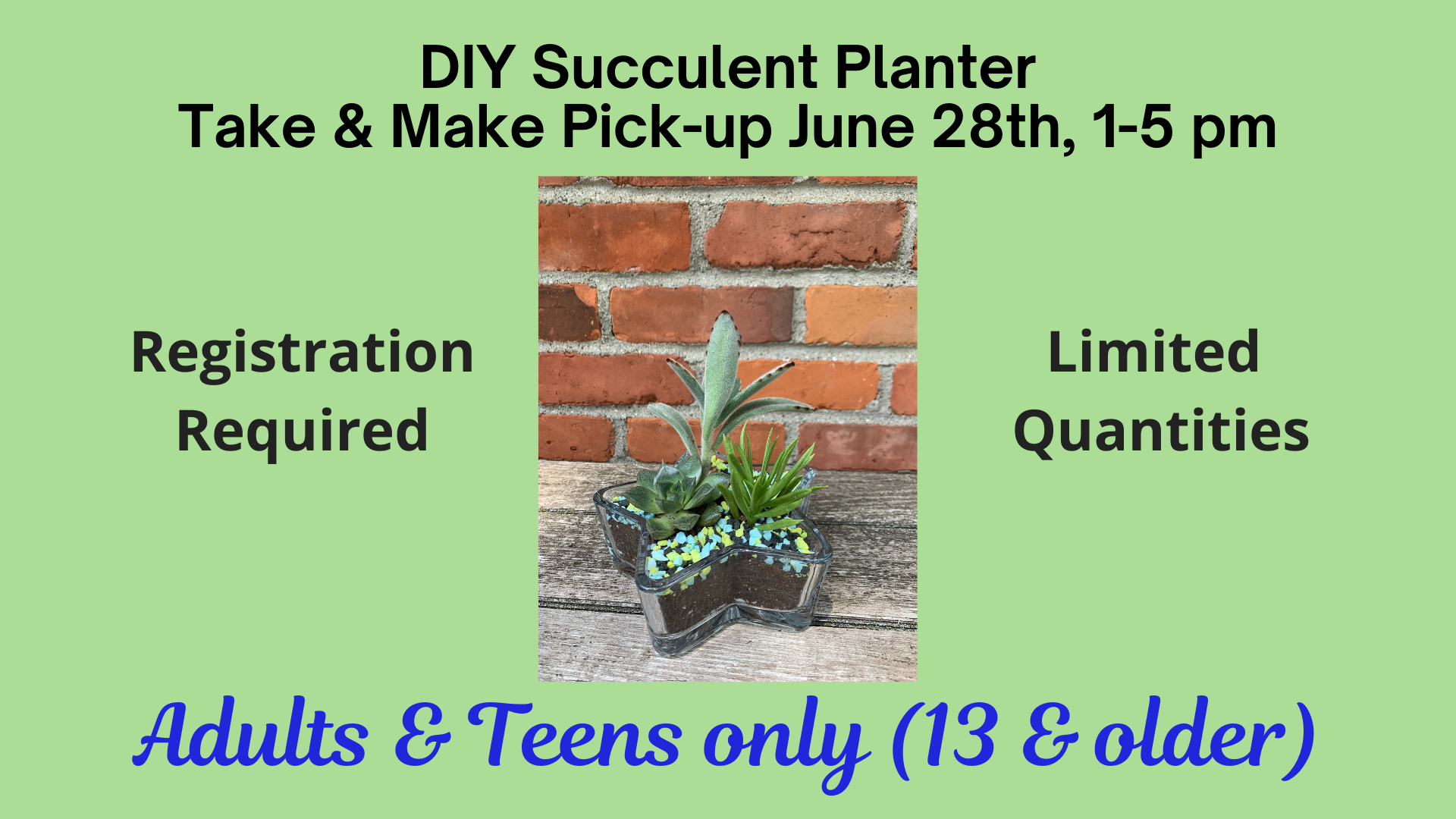 Diane, I did a DIY Succulent Planter Take & Make Kit for Teens and Adults at the end of June that was a huge success. I started with 15 kits and had at least that many on the wait list right away. I was able to get more plants and all of the rest of the supplies and ended up making 40 kits and all were picked up! Supplies were purchased from Dollar Tree and Lowes. I purchased the succulents from Kroger for $1 each, which is a bargain. I think these succulents are still available at Kroger as long as they have plants outside, which is where they were at the Kroger stores in the Detroit Metro area. Total cost of the kits were approximately $5 per kit, one kit per person. I can send my instructions for the kits and the amounts for each supply item included in the kit, if anyone is interested. [image: DIY Succulent Planters Make & Take 28June2021 FB Event Cover.png] Tina Tina Marie Russette Adult/Teen Services Manager Holly Township Library 1116 N. Saginaw St. Holly, MI 48442 248-634-1754 On Wed, Jul 28, 2021 at 11:52 AM Diane Willick via Michlib-l < michlib-l@mcls.org> wrote:
