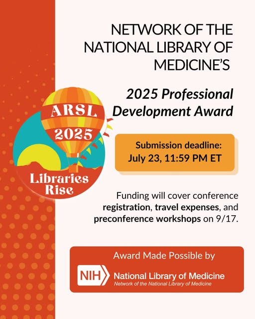 [May be an image of text that says "NETWORK OF THE NATIONAL LIBRARY OF MEDICINE'S ARSL 2025 Professional Development Award 2025 Submission deadline: July 23, 11:59 PM ET Libraries Rise Funding will cover conference registration, travel expenses, and preconference workshops on 9/17. Award Made Possible by NIH National Library of Medicine Network of of he National Library of Medicine"] Applications are now open for Professional Development Awards from the Network of the National Library of Medicine (NNLM) to attend #ARSL2025<https://www.facebook.com/hashtag/arsl2025?__eep__=6&__cft__%5b0%5d=AZX4aBNPRCjUPUIwrdvz_enKEw9rhi0GzRlfP245-UZTOcSL8UXEVCtlKbLPr9nCXW4T1wSnxpty-rFecSxhWpg5bICD6_deSkiWlB-jCOizDYIQQHxxlBeJ_ztESRs7StDHYEfkdAOl7OpAUtNMqt0HJ-YjZuf-nngSshN9Q6Q9YSHQXcP97nHE3mLrj9wht1fNMnNzpPemU8zFH-CGJxte&__tn__=*NK-R>! This opportunity supports rural and small library staff in building health information expertise for their communities - with $1500 in funding to attend #ARSL2025<https://www.facebook.com/hashtag/arsl2025?__eep__=6&__cft__%5b0%5d=AZX4aBNPRCjUPUIwrdvz_enKEw9rhi0GzRlfP245-UZTOcSL8UXEVCtlKbLPr9nCXW4T1wSnxpty-rFecSxhWpg5bICD6_deSkiWlB-jCOizDYIQQHxxlBeJ_ztESRs7StDHYEfkdAOl7OpAUtNMqt0HJ-YjZuf-nngSshN9Q6Q9YSHQXcP97nHE3mLrj9wht1fNMnNzpPemU8zFH-CGJxte&__tn__=*NK-R>, including registration, travel, and a required preconference workshop on consumer health information. [?] [?] [?]Deadline to apply: July 23, 2025 at 11:59 PM ET [?]Must attend: Health Reference Express: Communication and Confidentiality Essentials for Library Workers - Wed, September 17, 2:00-5:00 PM [?]Apply now & learn more: https://www.arsl.org/2025-preconference-workshops<https://www.arsl.org/2025-preconference-workshops?fbclid=IwZXh0bgNhZW0CMTAAYnJpZBExNTdwalhVSUdXaGJ2SnAwdwEejTvQaw1zYMgyoYuhcPvbb4isjO-D6u8NFk5lG2kcNoxTFCu7IQnJNWE3nCQ_aem_-vDQ5TdntQcAqJOoURDaHg> #LibraryWorkers<https://www.facebook.com/hashtag/libraryworkers?__eep__=6&__cft__%5b0%5d=AZX4aBNPRCjUPUIwrdvz_enKEw9rhi0GzRlfP245-UZTOcSL8UXEVCtlKbLPr9nCXW4T1wSnxpty-rFecSxhWpg5bICD6_deSkiWlB-jCOizDYIQQHxxlBeJ_ztESRs7StDHYEfkdAOl7OpAUtNMqt0HJ-YjZuf-nngSshN9Q6Q9YSHQXcP97nHE3mLrj9wht1fNMnNzpPemU8zFH-CGJxte&__tn__=*NK-R> #HealthLiteracy<https://www.facebook.com/hashtag/healthliteracy?__eep__=6&__cft__%5b0%5d=AZX4aBNPRCjUPUIwrdvz_enKEw9rhi0GzRlfP245-UZTOcSL8UXEVCtlKbLPr9nCXW4T1wSnxpty-rFecSxhWpg5bICD6_deSkiWlB-jCOizDYIQQHxxlBeJ_ztESRs7StDHYEfkdAOl7OpAUtNMqt0HJ-YjZuf-nngSshN9Q6Q9YSHQXcP97nHE3mLrj9wht1fNMnNzpPemU8zFH-CGJxte&__tn__=*NK-R> #NNLM<https://www.facebook.com/hashtag/nnlm?__eep__=6&__cft__%5b0%5d=AZX4aBNPRCjUPUIwrdvz_enKEw9rhi0GzRlfP245-UZTOcSL8UXEVCtlKbLPr9nCXW4T1wSnxpty-rFecSxhWpg5bICD6_deSkiWlB-jCOizDYIQQHxxlBeJ_ztESRs7StDHYEfkdAOl7OpAUtNMqt0HJ-YjZuf-nngSshN9Q6Q9YSHQXcP97nHE3mLrj9wht1fNMnNzpPemU8zFH-CGJxte&__tn__=*NK-R> #SmallLibraries<https://www.facebook.com/hashtag/smalllibraries?__eep__=6&__cft__%5b0%5d=AZX4aBNPRCjUPUIwrdvz_enKEw9rhi0GzRlfP245-UZTOcSL8UXEVCtlKbLPr9nCXW4T1wSnxpty-rFecSxhWpg5bICD6_deSkiWlB-jCOizDYIQQHxxlBeJ_ztESRs7StDHYEfkdAOl7OpAUtNMqt0HJ-YjZuf-nngSshN9Q6Q9YSHQXcP97nHE3mLrj9wht1fNMnNzpPemU8zFH-CGJxte&__tn__=*NK-R> #RuralLibraries<https://www.facebook.com/hashtag/rurallibraries?__eep__=6&__cft__%5b0%5d=AZX4aBNPRCjUPUIwrdvz_enKEw9rhi0GzRlfP245-UZTOcSL8UXEVCtlKbLPr9nCXW4T1wSnxpty-rFecSxhWpg5bICD6_deSkiWlB-jCOizDYIQQHxxlBeJ_ztESRs7StDHYEfkdAOl7OpAUtNMqt0HJ-YjZuf-nngSshN9Q6Q9YSHQXcP97nHE3mLrj9wht1fNMnNzpPemU8zFH-CGJxte&__tn__=*NK-R> #ProfessionalDevelopment<https://www.facebook.com/hashtag/professionaldevelopment?__eep__=6&__cft__%5b0%5d=AZX4aBNPRCjUPUIwrdvz_enKEw9rhi0GzRlfP245-UZTOcSL8UXEVCtlKbLPr9nCXW4T1wSnxpty-rFecSxhWpg5bICD6_deSkiWlB-jCOizDYIQQHxxlBeJ_ztESRs7StDHYEfkdAOl7OpAUtNMqt0HJ-YjZuf-nngSshN9Q6Q9YSHQXcP97nHE3mLrj9wht1fNMnNzpPemU8zFH-CGJxte&__tn__=*NK-R> Please note that the deadline to apply is July 23rd. Do not delay your application! Also you need not to be an ARSL member to apply. However, I will be happy to help you achieve that as well ;> John Clexton 2025 ARSL President Library Director Gladwin County District Library jclexton@gcdl.org 989-347-1007 [cid:image007.png@01DBF1B9.94B909C0]