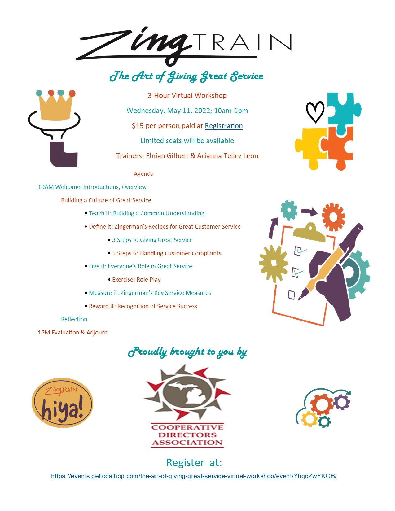 Hi Everyone Michigan Cooperative Directors Association is proud to bring you a Zingerman’s Customer Service Webinar called ZingTrain’s The Art of Giving Great Service, it will be a 3-hour virtual workshop. It is open to all libraries in any of the Michigan Cooperatives. There is a $15.00 fee per person (Credit Card only) and it will be on Wednesday May, 11, 2022 starting at 10 am. There is a limited number of seats, first to register gets the seats.*There are still open seats available but they are getting fewer and fewer*. If we sell out we will be having a waiting list to see the interested in doing a second webinar. You can register at https://events.getlocalhop.com/the-art-of-giving-great-service-virtual-works... If you have a problem with registration contact Kate Pohjola Andrade kate@woodlands.lib.mi.us If you have a question about webinar contact Eric Palmer epalmer@mmlc.info or your Cooperative Director. [image: Zingerman's Service 5_11_22.jpg]