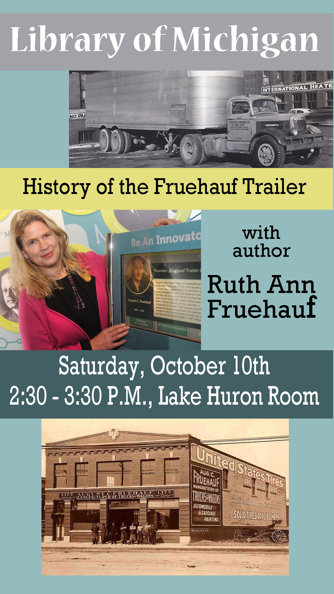 All Welcome! Saturday October 10th at the Library of Michigan, 2:30-3:30 Author Ruth Ann Fruehauf will be talking about her book Singing Wheels and her grandfather's company of truck trailers in Michigan. To commemorate her grandfather's 1914 invention of the semi-trailer, Ruth Ann Fruehauf wrote a book, "Singing Wheels'" honoring the successes and accomplishments of the Fruehauf family legacy. The Fruehauf Trailer Company was the dominant trailer manufacture for nearly a century and became the 75th largest company in the world when it declared bankruptcy in 1997. It all started in a Detroit shop operated by a hard working German immigrant, August Fruehauf. After inventing the concept of the semi-trailer, the company went onto invent the automatic fifth wheel hitch, the dump trailer, the tanker trailer, refrigerated trailers and the shipping container. The colorful history is captured in a coffee table book with 90 pages of photographs from the family archives. For more information please visit www.singingwheels.com.<http://l.facebook.com/l.php?u=http%3A%2F%2Fwww.singingwheels.com%2F&h=eAQHjOkTSAQERJXUqAalkZNybk5Dtu28-0Zjpr2qvZ7n6jA&enc=AZPEnwDtA45LN8QL_XiL0_ZNptDkFu_UZ-JERz-EBNcSnXcEyKhMmPf7fonVf42lDYPWCRtrN-NdfHW4vuVj-7F62sXlI9M71yUBmSP5zcfoZScdwRiGZDR7vpHDy5MTsjE24JOOftpWWwauOJMKHZMynHVo-I9ZM1hONcthssukJdgir-TniMRV71wmJf7ghwY_H1ZPti7oP7Pibmzus2BI&s=1> Edwina A. Murphy Michigan Collection Librarian Michigan Center for the Book Library of Michigan 702 West Kalamazoo St. Lansing, MI 48909