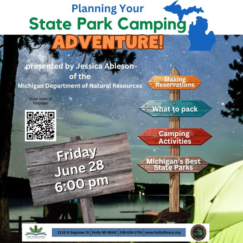 Hey! Last minute notice about a State Park Camping Adventure Program at 6 pm presented by a MDNR staff member. Join us if you are interested and near Holly Township MI. [image: 28Camping poster (800 x 800 px) (3).png] -- Tina Marie Russette (she/her) Adult Services Manager Holly Township Library 1116 N. Saginaw St. Holly, MI 48442 248-634-1754