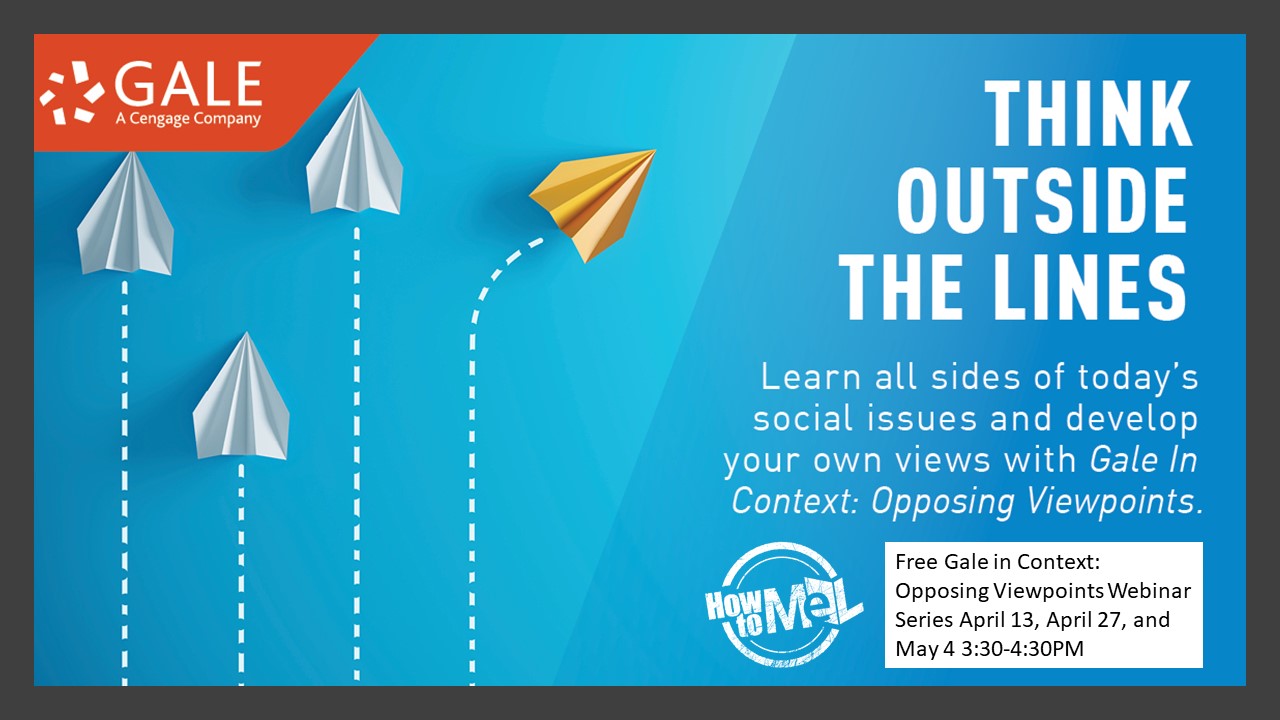 *Gale and MeL have teamed up to provide a FREE webinar series in April and May. Michigan library staff members are invited to join us to learn more about Gale in Context: Opposing Viewpoints and Gale Business: DemographicsNow. Free SCECH hours available to Michigan educators who attend the live webinars. Recordings will be sent to all who register in case you are unable to attend the live events. Information and registration links below. We look forward to sharing these excellent eResources with you!*