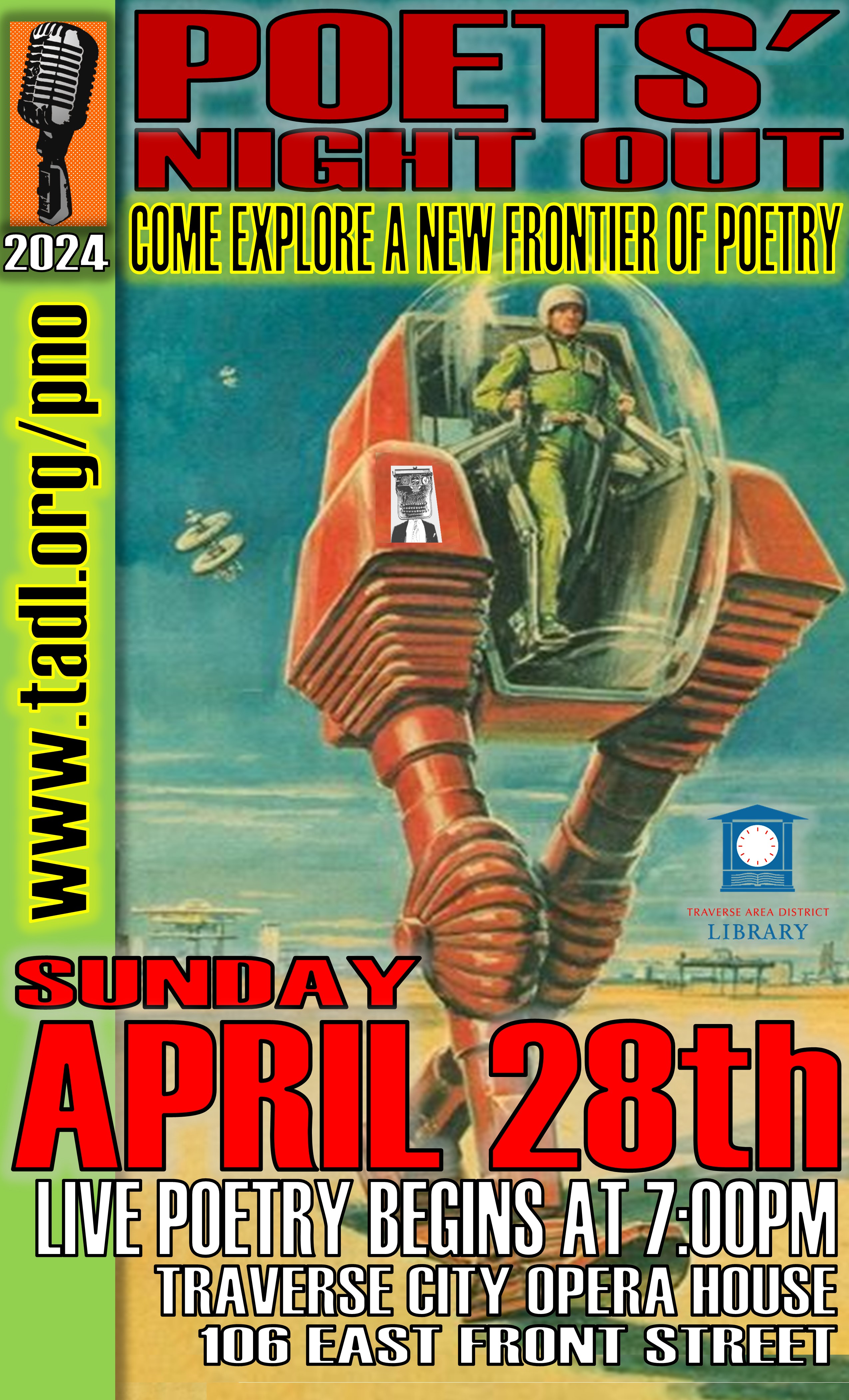Anyone have plans for Sunday April 28th at 7:00pm? No?! Well, we have the night out for you! Whether you are a poetophil, logophile or just like a fun, FREE event in a historic venue--join us for our annual Poets' Night Out. This was a juried contest and the winners will read their poems at this event. Your job is to enjoy yourself and listen to some *really *great, local poetry (although you do get to vote for your favorites as well). Poets' Night Out <https://www.tadl.org/event/poets-night-out-live-reading-14238>will be at the Traverse City Opera House (106 E Front St, Traverse City) at 7:00pm on Sunday April 28th. You know what?! I have a great idea! *YOU* should make a day of it! Come to the Traverse Area District Library (610 Woodmere Ave) first at 2:00pm and listen to Anthony Williams <https://www.tadl.org/morelchamp>the FIVE time National Morel Hunting Champion give you tips and tricks on finding the elusive fungi...eat an early dinner downtown and then walk over to the Opera House for a fun night of poetry. Two FREE events and a meal of your choosing. What could be better? I just planned your day for you. The hard work is in the planning and now that is done. You have no excuses. :) Although...you might have to work (like me) so if you aren't able to make it, will you share our poster and invite anyone/everyone? Remember to stress that it is a free event. No really, FREE. In person, everyone can come. (Poster attached). Thank you! #poetsnightout #morels #FREE -- *Betsy Myers* Reference Department Interlibrary Loan/Programming *Traverse Area District Libra* 610 Woodmere Ave Traverse City, MI 49686 231 932-8502