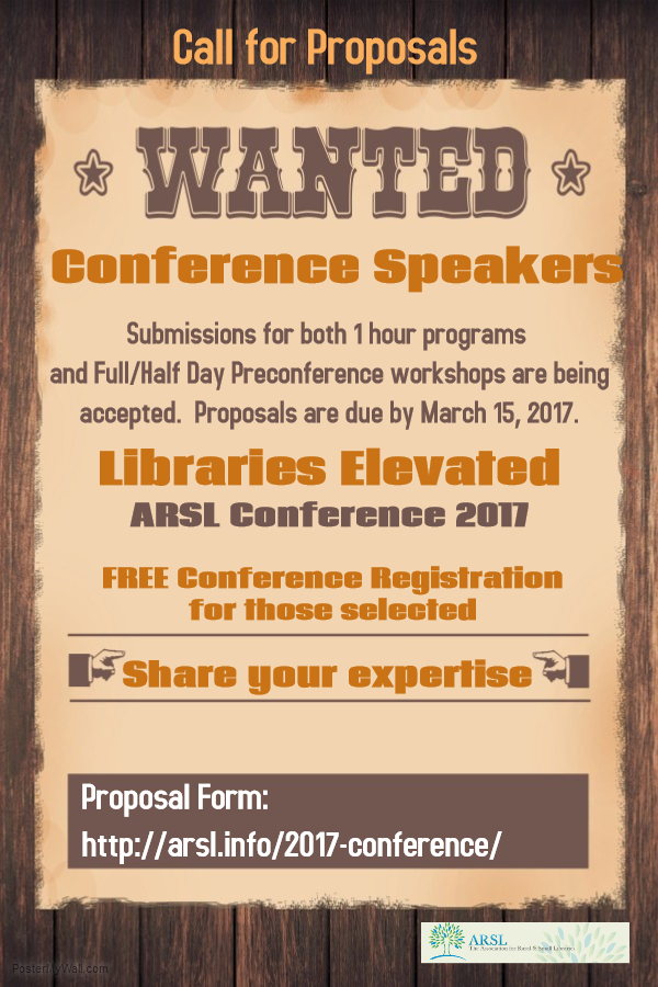If you have a conference session idea, ARSL is listening! See details below, and, once again, please forgive cross postings. Thanks, Colleen Colleen Leddy, Director Stair District Library 228 W. Main St. Morenci, MI 49256 517/458-6510 ARSL 2017 Conference: Libraries Elevated Sept 7-9, St. George Utah Call for Proposals is open. Share your expertise. We all love topics that take our libraries from ordinary to extraordinary. Doing something innovative or offering a new service at your library? Is your library offering successful programs that others could replicate? Bring your best to ARSL 2017 and share with attendees. Submissions for one (1) hour programs and Full/Half Day Pre-conference workshops are being accepted. Proposals are due by March 15, 2017. Submit your proposal today! The form can be found here: *http://tinyurl.com/zvl7aam <http://tinyurl.com/zvl7aam>* Contact Linda Green with questions: linda.green@conwaycountylibrary.org. Jennie Garner, Library Director North Liberty Community Library PO Box 320 North Liberty, IA 52317 319-626-5778 <%28319%29%20626-5778> (w) 319-321-8056 <%28319%29%20321-8056> (c) www.northlibertylibrary.org