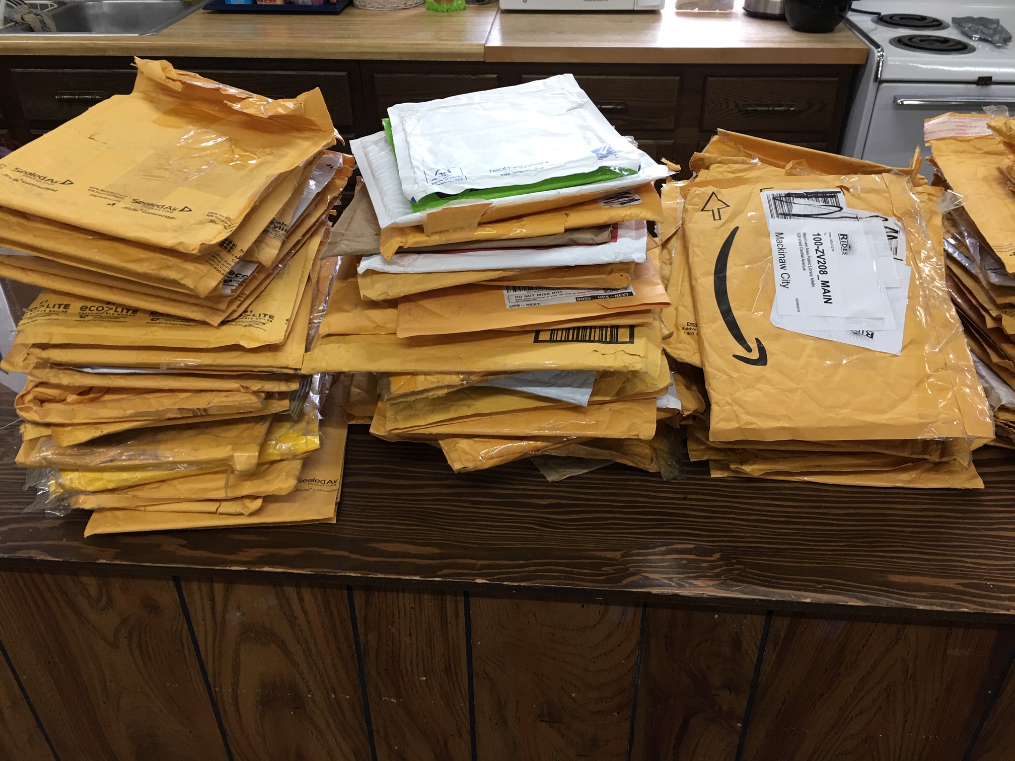 We have way too many used padded envelopes of all sizes. We do not have boxes big enough to send them all but if you would like some let me know. We don't want them in the trash but any left at the end of the week are going away. Tanya R. Procknow Mackinaw Area Public Library Youth Librarian (231)436-5451