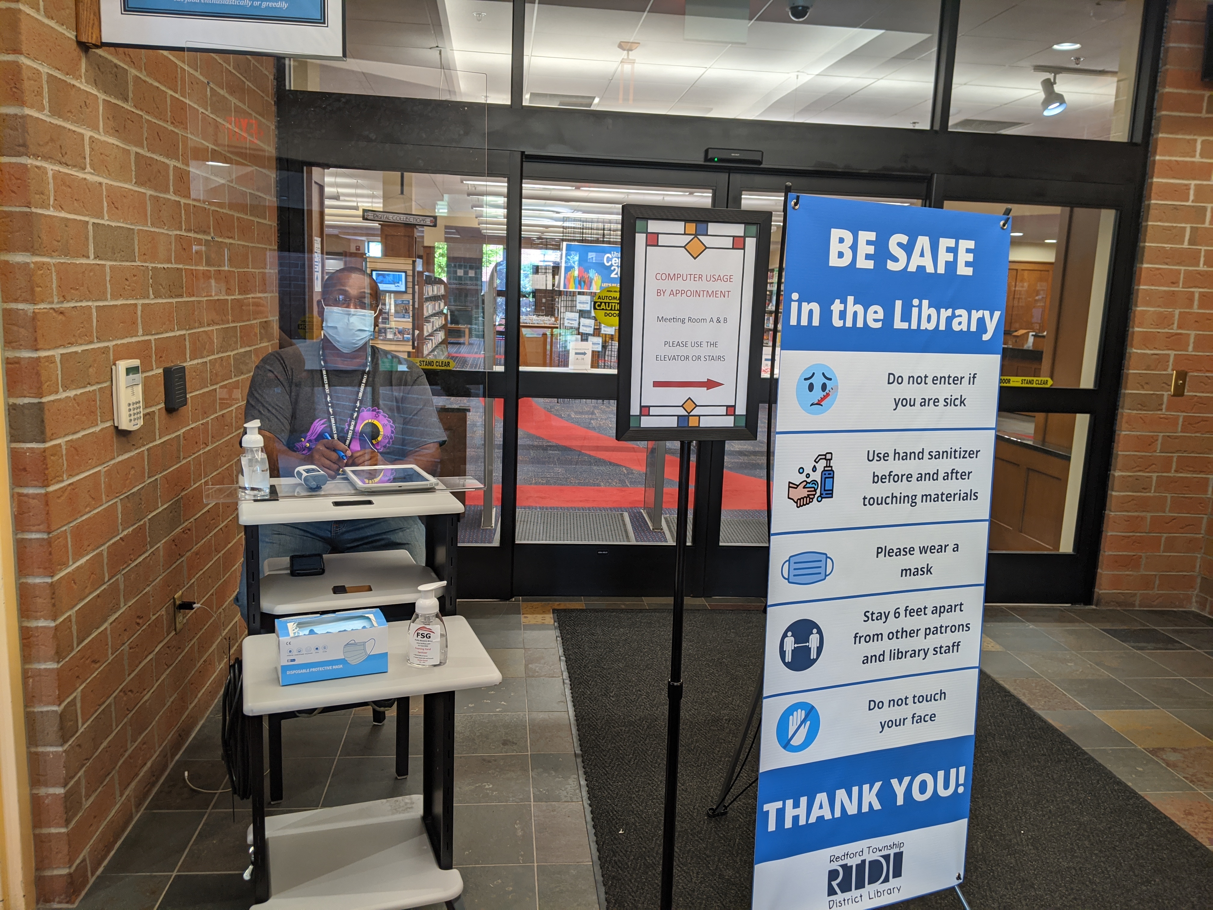 We added a podium and a stool to our entry way. We have handmade masks available for those who do not have one and we placed them on the entry way bench because it is handy. There is a large sign outside the front door indicating the new rules. We have provided staff with a mask, and a face shield. Each person entering is greeted by a staff member behind the podium. Each person who is not wearing a mask is asked to either produce one or take one of ours before entering. Each person entering or leaving is counted (small manual keychain counter) so that we maintain the total number of patrons in the building. So it's a simple operation. Podium, staff member, masks, counter. We also have hand sanitizer and wipes for the staff member to prepare the station for the next person. We have provided staff with a mask and a face shield. [cid:e3774a48-7302-4d49-a135-78e1cdbeb9a6] Kelli Perkins Collection & Digital Resources Manager Herrick District Library 300 S River Ave, Holland MI 49423 616.355.3718 kperkins@herrickdl.org ________________________________ From: Michlib-l <michlib-l-bounces@mcls.org> on behalf of Emily Dumas via Michlib-l <michlib-l@mcls.org> Sent: Friday, July 10, 2020 9:40 AM To: michlib-l@mcls.org <michlib-l@mcls.org> Subject: [Michlib-l] Welcome stations for libraries open to the public Good morning! This question is for any library that has already reopened to the public, or is planning to soon: Do you have a "welcome" station for patrons when they first arrive in which they can get a rundown of new procedures, be provided a mask if they need one, etc.? If so, could you share a photo with me or provide a description of what it will be like? Thanks in advance! Emily -- Emily M. Dumas Library Director Royal Oak Public Library 248.246.3710