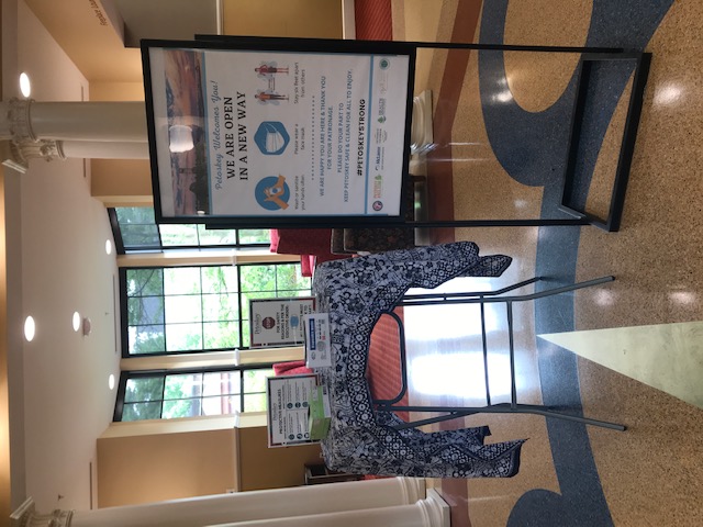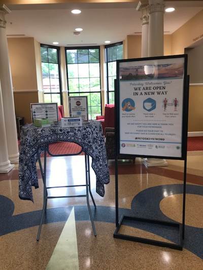 Do you have a "welcome" station for patrons when they first arrive in which they can get a rundown of new procedures, be provided a mask if they need one, etc.? If so, could you share a photo with me or provide a description of what it will be like?