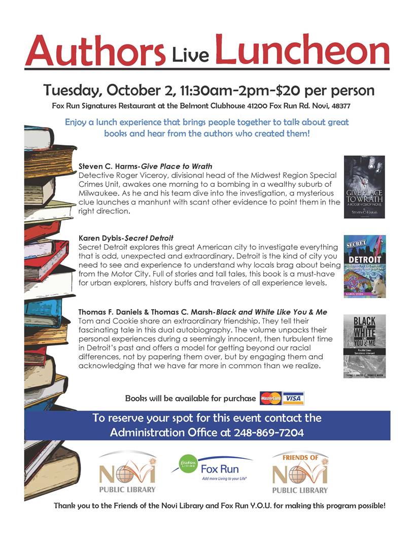 Hello Library Colleagues! Yesterday, the Novi Library hosted 4 authors. The event was a huge success with 150 guests in attendance for a luncheon. If you want information about any of these writers, don’t hesitate to contact me. All were professional, engaging and of interest to our listeners. The each provided a 20 minute talk, then selling & signing of their books. I know they could have talked longer had they been on their own. Thank you, Julie