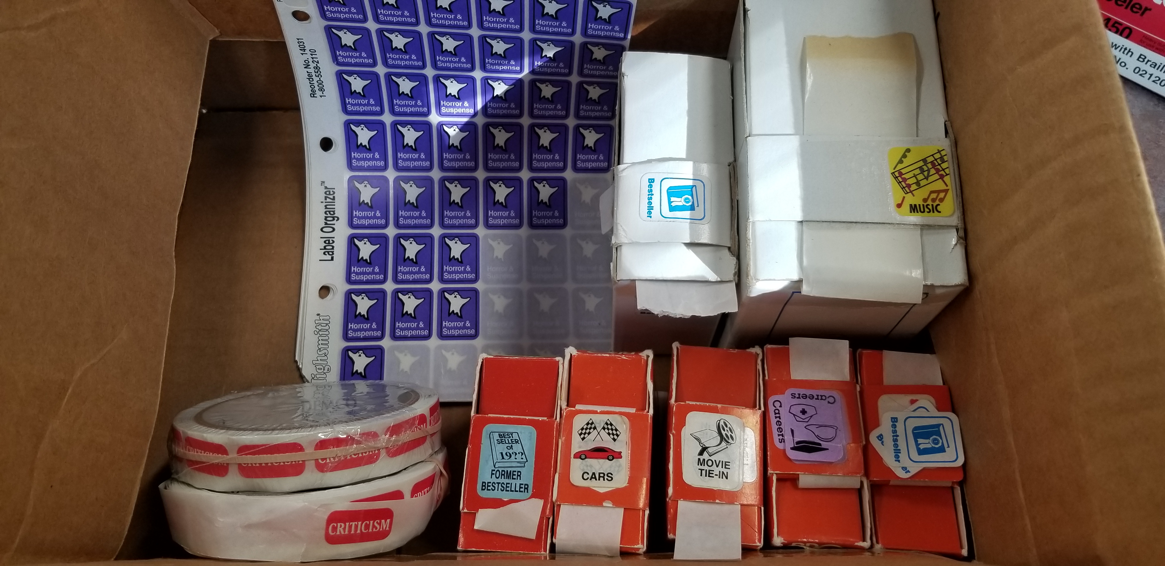 As we are spring cleaning (a bit late in the year, I know!) we came across some genre classification labels that we no longer use and would like to pass along to a library that may benefit from them. If you want one, you will get them all--one shot out the door. First one to send me your RIDES code wins! I have attached a picture but if it does not come through well, the labels are Music, Bestseller, Former Bestseller, Cars, Movie Tie-In, Careers, Criticism and Horror & Suspense. [image: Genre Labels.jpg] -- *Betsy Myers* Reference Department Interlibrary Loan/Programming *Traverse Area District Library* 610 Woodmere Ave Traverse City, MI 49686 231 932-8502