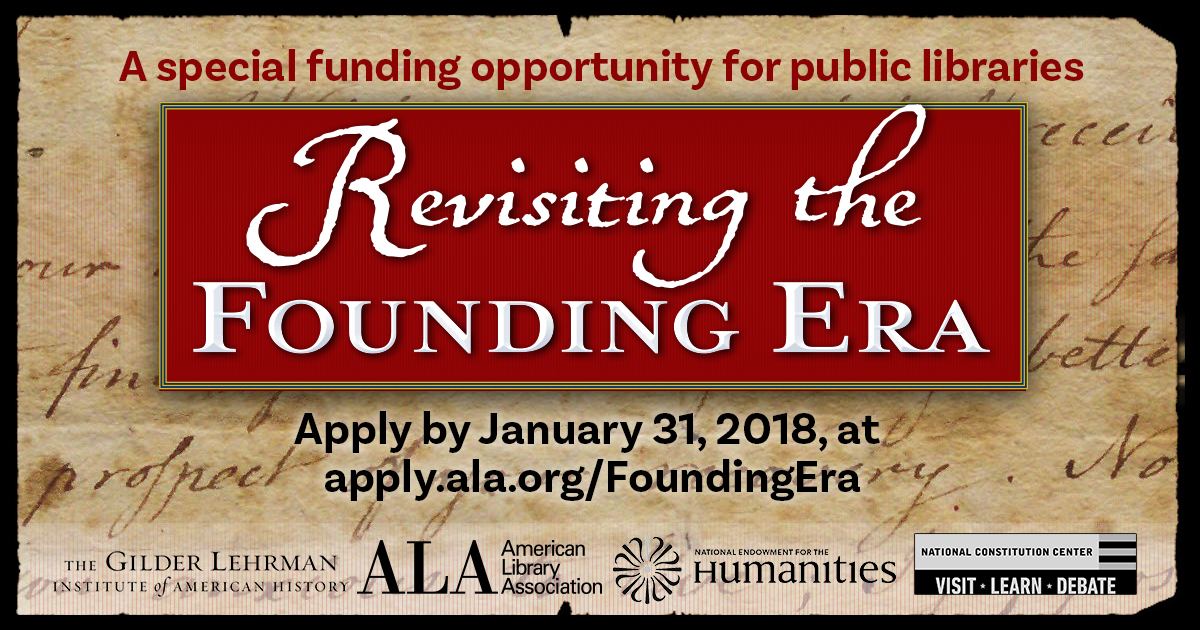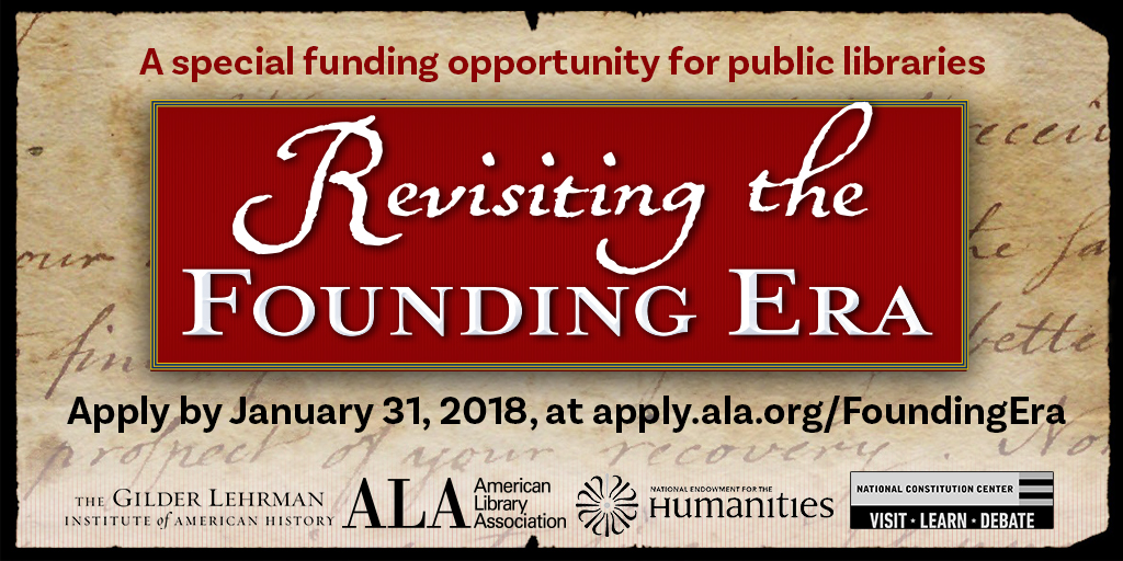 ________________________________ Please see below for information about a new grant opportunity for public libraries from ALA’s Public Programs Office. Rural and/or underserved communities are encouraged to apply. I’m also attaching Facebook and Twitter images, in case that is an easier way for you to share the announcement. Any questions, please let me know. Thanks and happy holidays! –Sarah, ALA Public Programs Office *** APPLY NOW: Revisiting the Founding Era Public libraries are invited to apply for Revisiting the Founding Era<http://www.programminglibrarian.org/articles/apply-now-revisiting-founding-era>, a nationwide project that will use historical documents to spark public conversations about the Founding Era’s enduring ideas and themes and how they continue to influence our lives today. Revisiting the Founding Era is a project of the Gilder Lehrman Institute of American History in collaboration with American Library Association (ALA) and the National Constitution Center. The project is supported by the National Endowment for the Humanities (NEH). Up to 100 U.S. public libraries will be selected to host programs related to the American Revolution and the early years of the nation. Participating libraries will receive: * 10 copies of a 100-page reader containing selected documents from the lauded Gilder Lehrman Collection, one of the great archives in U.S. history * $1,000 to help implement discussion groups and other public programs * Training, resources and support Libraries, working in collaboration with scholars, local experts and others, will be asked to implement at least three public programs for adult and teen audiences. Topics may include the rights of citizens versus the rights of government; who is “we the people?”; and decision-making and taking action. Read the full project guidelines<https://apply.ala.org/foundingera/guidelines> and apply online<https://apply.ala.org/foundingera> by January 31, 2018. Public libraries serving rural or underserved communities are especially encouraged to apply. Revisiting the Founding Era will be administered by ALA’s Public Programs Office. _______________ Sarah Ostman Communications Manager Public Programs Office American Library Association 312-280-5061