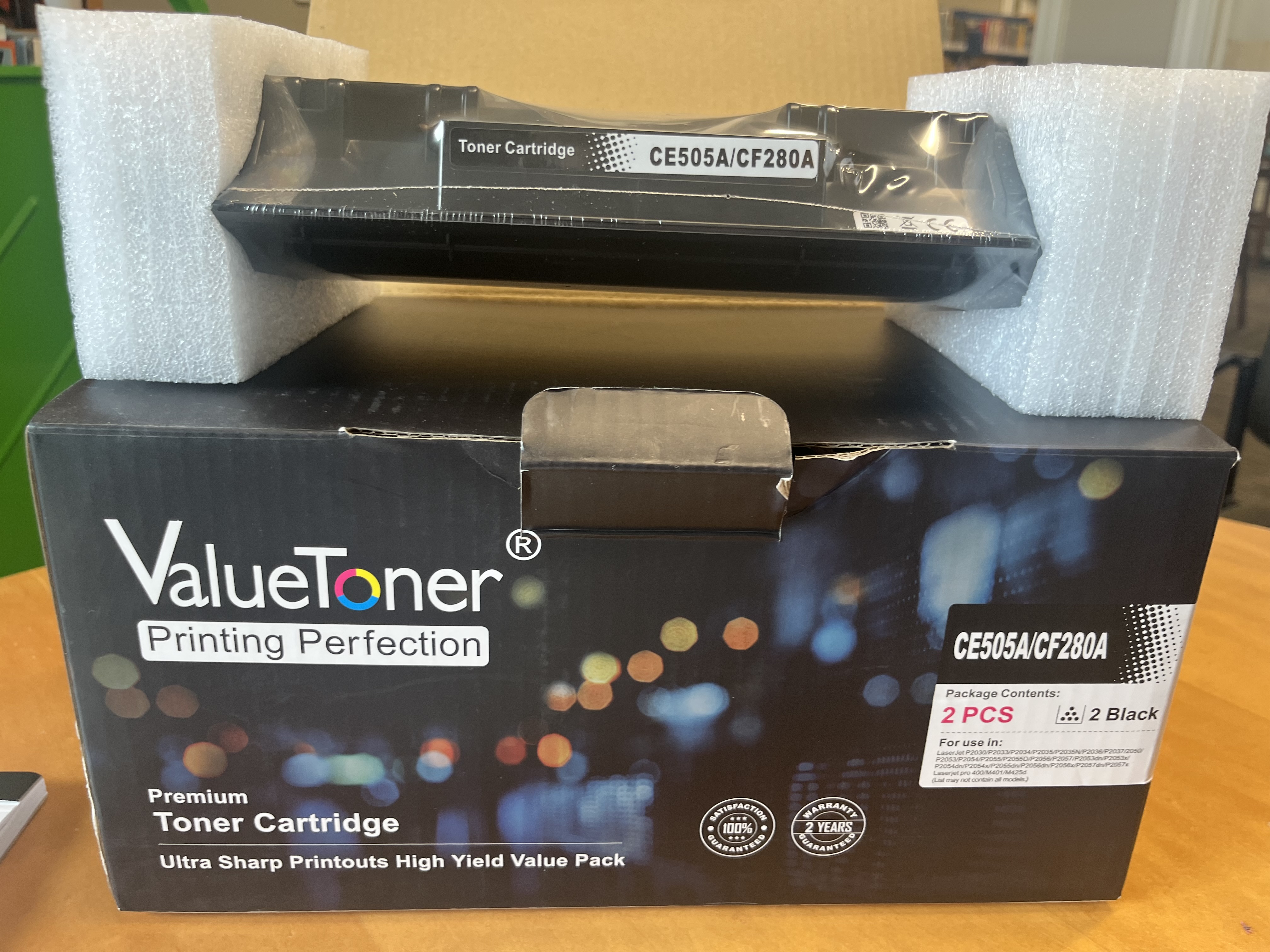 We have 1 black toner available to give to the first to claim. CE505A/CF280A Thanks! Erin Zabonick Assistant Director/Adult and YA Librarian Three Rivers Public Library - READ. LEARN. DREAM. - 88 North Main Three Rivers, MI 49093 269-273-8666 [cid:feeb7bf9-2a1e-4f75-af48-eb6692be5b40]