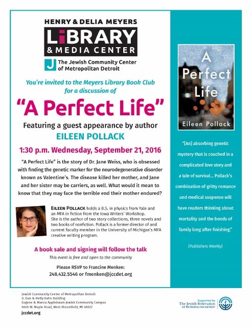 PLEASE JOIN US! "AN AFTERNOON WITH EILEEN POLLACK" AUTHOR OF "A PERFECT LIFE" FREE AND OPEN TO THE COMMUNITY! WEDNESDAY, SEPTEMBER 21, 2016 AT 1:30 PM RSVP: Francine Menken 248.432.5546 or fmenken@jccdet.org