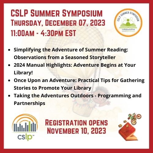 CSLP's Virtual Summer Symposium Thursday, December 7, 2023 11 am to 4:30 pm EST Registration Opens on November 10, 2022 SAVE the DATE! The Collaborative Summer Library Program's Summer Symposium (FREE) is a half-day virtual offering for public library staff to connect, learn, and collaborate as we plan for summer library programming around the 2024 theme of Adventure Begins at your Library. Sessions will include: * Simplifying the Adventure of Summer Reading: Observations from a Seasoned Storyteller - Jenifer Strauss * 2024 Manual Highlights: Adventure Begins at Your Library! - Alyssa Graybeal and manual committee chairs. * Once Upon an Adventure: Practical Tips for Gathering Stories to Promote Your Library - Angela Hursh * Taking Adventure Outdoors: Programming and Partnerships facilitated by Amanda Raiche Not able to attend the virtual event live? Recordings will be available after the event. If you expect to only view the recorded sessions, you can sign-up at registration to have an email sent when the recordings are posted. [A white and red poster with text Description automatically generated]