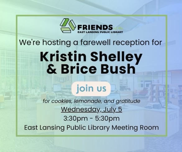Hi everyone, The East Lansing Public Library (ELPL) administration is moving on to new adventures! ELPL Director Kristin Shelley is moving to Indiana to become the Executive Director at the Hussey-Mayfield Memorial Public Library located in Zionsville. ELPL Assistant Director Brice Bush is moving to northern Michigan to become the next Director of the Cheboygan Area Public Library. Please join us for a Farewell Reception hosted by the Friends of the East Lansing Public Library on Wednesday, July 5 from 3:30 – 5:30 pm in the Library Meeting Room. We are celebrating and we’d love for you to join us! Brice Bush, Assistant Director (she/her) East Lansing Public Library 950 Abbot Road East Lansing, MI 48823 bbush@cityofeastlansing.com<mailto:bbush@cityofeastlansing.com> Office: (517) 319 6939 Mobile: (989) 284 7598 [cid:6D19F1A0-DAAD-48D7-9F21-A2CEF697CBBE]