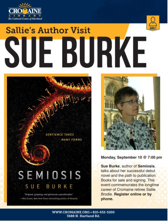 For our Sallie's Author Visit, commemorating longtime Cromaine retiree Sallie Brodie, we are hosting Sue Burke on Monday, September 10 at 7:00 pm. All are welcome to register and attend. Held at Cromaine District Library, 3688 N. Hartland Rd, Hartland, MI 48353. Contact us at 810-632-5200 for more information. [image: image.png]