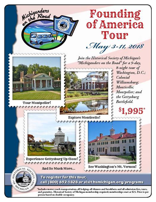 Are you looking forward to warmer weather? Join Michiganders on the Road in May and discover how the United States originated with our "Founding of America Tour!" <http://hsmichigan.org/programs/michiganders-on-the-road/founding-america-to ur/> Our seats are filling up fast-don't miss out! <http://hsmichigan.org/programs/michiganders-on-the-road/america-tour-regist ration/> Register today. <https://hsmichigan.org/wp-content/uploads/2017/10/founding-of-america-tour. pdf> See the detailed itinerary <http://hsmichigan.org/programs/michiganders-on-the-road/america-tour-regist ration/> Register today <https://hsmichigan.org/wp-content/uploads/2017/10/founding-of-america-tour- registration.pdf> Download the registration form The Founding of America Tour takes place May 3-11, 2018, and departs from the HSM offices in Lansing, Michigan, with two pickup stops in Ann Arbor and Toledo. A detailed itinerary can be found on our website. Reservations can be made by mail, going online, or by calling (800) 692-1828. _____ _____ The Historical Society of Michigan is our state's oldest cultural organization, founded in 1828 by territorial governor Lewis Cass and explorer Henry Schoolcraft. A nongovernmental nonprofit, the Society focuses on publications, conferences, education, awards and recognition programming, and support for local history organizations to preserve and promote Michigan's rich history. _____ For more information on the Historical Society of Michigan, please visit <http://www.hsmichigan.org/> www.hsmichigan.org or e-mail us at <mailto:hsm@hsmichigan.org> hsm@hsmichigan.org. _____ The Historical Society of Michigan 5815 Executive Dr. . Lansing, MI 48911 Phone: (517) 324-1828 . FAX: (517) 324-4370 This e-mail is sent to our members and friends to keep you updated on historical activities and opportunities to learn more about our state's history. To opt-out, please respond to this e-mail with "remove" in the subject line.