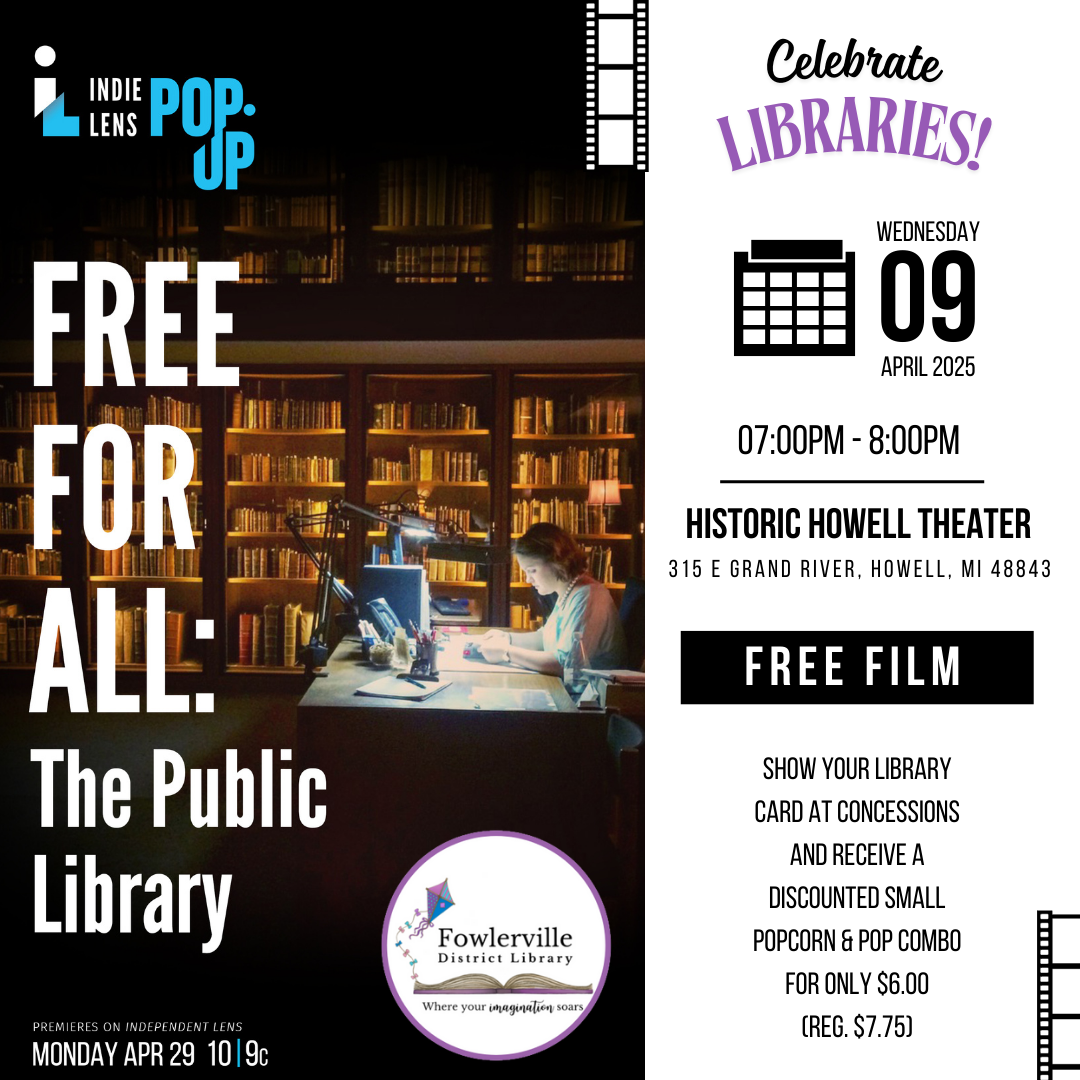 Dear Fellow Librarians, To quote Evelyn Carnahan from "The Mummy" — ". . .I am proud of what I am. [And what is that?] I am a librarian." Fowlerville District Library is thrilled to host one of 250 free screenings nationwide (and the only one in mid-Michigan) of a forthcoming documentary entitled "Free for All: The Public Library" (Runtime: 60 mins., Not Rated) on Wednesday, April 9 @ 7 pm at the Historic Howell Theater, 315 E Grand River, Howell. The film will premiere on Independent Lens on Monday, April 29 at 10/9c, but this is your chance to see it first and in good company. https://www.pbs.org/independentlens/documentaries/free-for-all/ [https://www.pbs.org/independentlens/wp-content/uploads/2024/07/nypl.digitalcollections.510d47d9-816a-a3d9-e040-e00a18064a99.001.w_1280x720.jpg]<https://www.pbs.org/independentlens/documentaries/free-for-all/> Free for All: The Public Library - Independent Lens - PBS<https://www.pbs.org/independentlens/documentaries/free-for-all/> About the Documentary. Free for All: Inside the Public Library tells the story of the quiet revolutionaries who made a simple idea happen. From the pioneering women behind the “Free Library ... www.pbs.org With the current political climate, the anti-library nonsense and accusations of grooming (I don't recall "Grooming for Librarians 101" as an option in the course catalog when I attended Wayne State), this film explores the history of public libraries in America and reinforces why we do what we do. This film will make you mad, make you laugh, make you cry, and also make you cheer — for us. So grab your librarian friends and colleagues, put on your library shirts, and let's take over the Historic Howell Theater on Wednesday, April 9 — this is National Library Week, by the way. The theater seats 212. How awesome would it be for 200 librarians to converge on Howell! Grab some dinner, do a little shopping, and come to my free screening. Doors open at 6 pm and the film starts at 7 pm. Show your library card at the concession stand and get a small popcorn and pop combo for a discounted price of only $6 (reg. $7.75). Some of us Livingston County libraries will have info tables in the lobby. If you have a story you want to share about why you became a librarian or an uplifting story about a life that was changed because of your library, please email me. We will share some of them before and after the screening. Here is the trailer: https://youtu.be/OD45tDYf6qU?si=4KeTsLrQCEtaxpHp Here is your official invitation: [cid:46efd017-dd67-4c73-98c7-77962c452cd4] Yes, this event is open to the public, too, if you want to share it out. Hope to see you there! Cheers, Isabella Rowan, MLIS Executive Director Phone: 517-223-9089, Ext. 111 130 S. Grand Ave. Fowlerville, MI 48836 https://www.fowlervillelibrary.net/ [cid:54a54f48-7ef8-4d57-bd5c-c87726df42d3] This message is intended only for the use of the individual or entity to which it is addressed, and may contain information that is privileged, confidential, and/or exempt from disclosure under applicable laws. If the reader of the message is not the intended recipient, or the employee or agent responsible for delivering the message to the intended recipient, you are hereby notified that any dissemination, distribution or copying of this communication is strictly prohibited. If you have received this communication in error, please notify us immediately by telephone and/or reply to this e-mail message. Thank you.
