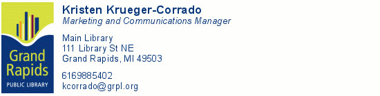 Congratulations to the GRPL!!! On Nov 8, 2017, at 12:14 PM, Lupita Garza-Grande via Michlib-l <michlib-l@mcls.org<mailto:michlib-l@mcls.org>> wrote: Yes! I voted, and made sure to spread the news. So glad that it passed! Lupita On Wednesday, November 8, 2017, 10:04:18 AM EST, Shelley Williams via Michlib-l <michlib-l@mcls.org<mailto:michlib-l@mcls.org>> wrote: Congratulations! Fantastic. Shelley On Wed, Nov 8, 2017 at 9:50 AM, Kristen Krueger-Corrado via Michlib-l <michlib-l@mcls.org<mailto:michlib-l@mcls.org>> wrote: Yesterday the Grand Rapids Public Library passed our 20-year millage continuation with 71% of the vote! Library love wins! -- <signature.gif> ______________________________ _________________ Michlib-l mailing list Michlib-l@mcls.org<mailto:Michlib-l@mcls.org> http://mail2.mcls.org/mailman/ listinfo/michlib-l<http://mail2.mcls.org/mailman/listinfo/michlib-l> -- Shelley Williams Director, White Lake Community Library 3900 White Lake Dr. Whitehall, MI 49461 Read Early. Read Often. _______________________________________________ Michlib-l mailing list Michlib-l@mcls.org<mailto:Michlib-l@mcls.org> http://mail2.mcls.org/mailman/listinfo/michlib-l <signature.gif>_______________________________________________ Michlib-l mailing list Michlib-l@mcls.org<mailto:Michlib-l@mcls.org> http://mail2.mcls.org/mailman/listinfo/michlib-l